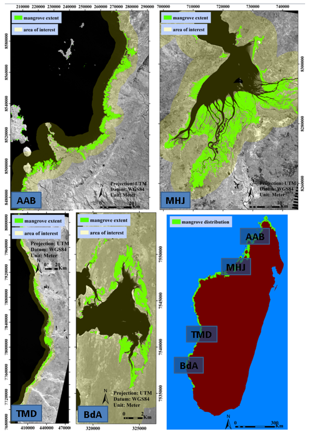 Here, we inventory and compare existing national-level mangrove maps for Madagascar. Using the most comprehensive and contemporary available data, we quantify nation-wide mangrove dynamics from 1990 to 2010. To use these data to examine dynamics at a finer scale, we partition Madagascar’s mangroves in to non-contiguous, primary (i.e., >1000 ha) mangrove ecosystems; with focus on four distinct mangrove ecosystems representing areas of interest (AOIs): Ambaro-Ambanja Bays (AAB), MHJ, Tsiribihina Manambolo Delta (TMD) and Baie des Assassins (BdA. Given the limitations of national-level maps for certain localized applications, and the limitations of existing and/or lack of ecosystem-specific maps for AOIs, we build on two previous studies for AAB and MHJ [,] and employ Landsat data to produce detailed, contemporary, maps of TMD and BdA. The applications of existing (AAB; MHJ) and new (TMD; BdA) AOI-specific maps to mangrove conservation initiatives through Blue Ventures’ Blue Forests programme are discussed.