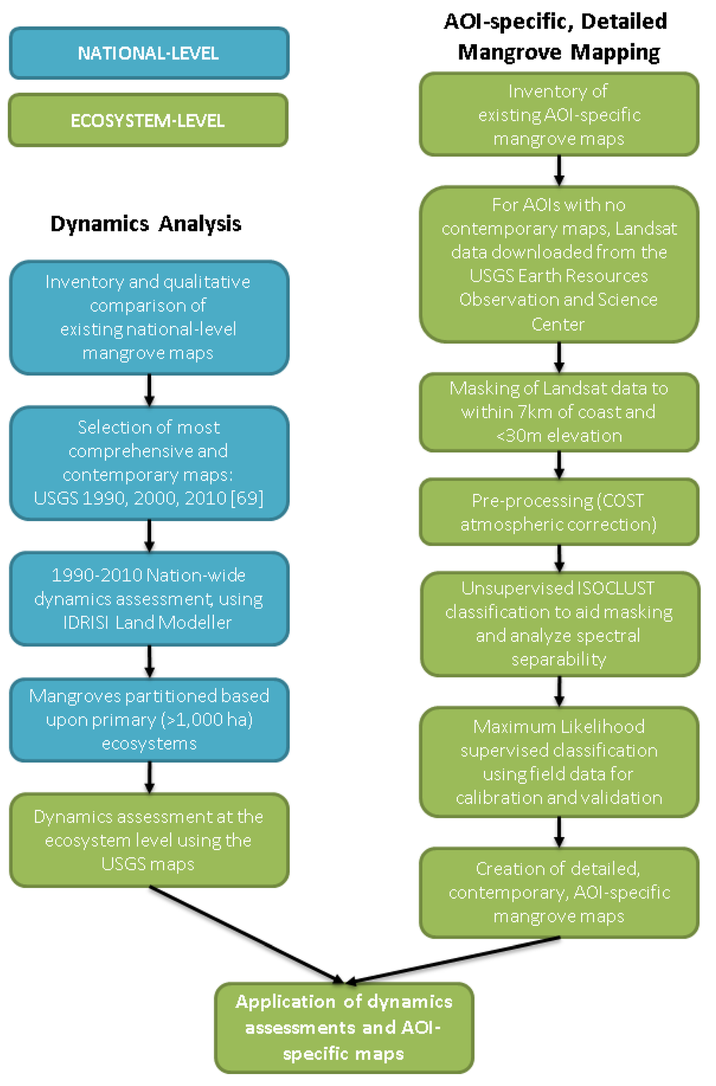 Workflow. Blue boxes represent national-level processing including the entire distribution of Madagascar’s mangroves. Green boxes represent ecosystem-level processing, including 30 primary mangrove ecosystems, with focus on four AOIs (i.e., Ambaro-Ambanja Bays (AAB), Mahajamba May (MHJ), Tsiribihina-Manambolo Delta (TMD) and Baie des Assassins (BdA)). The results of nation-wide and ecosystem-specific dynamics from 1990 to 2010, and ecosystem-specific maps for TMD and BdA are presented in this study for the first time. The production of ecosystem-specific maps builds on previous studies which employed similar methods for AAB and MHJ (i.e., Jones et al. []; Jones et al. []).