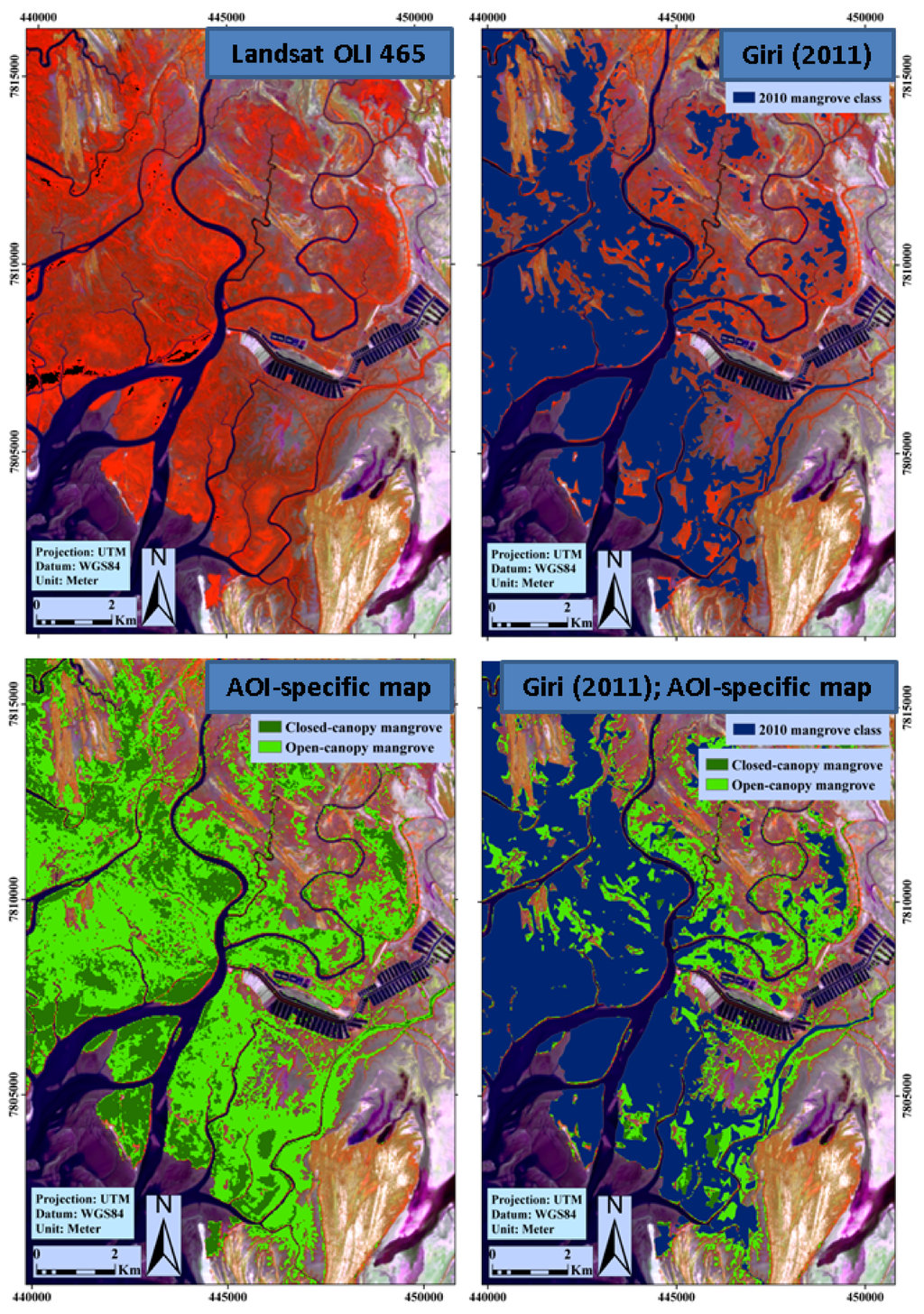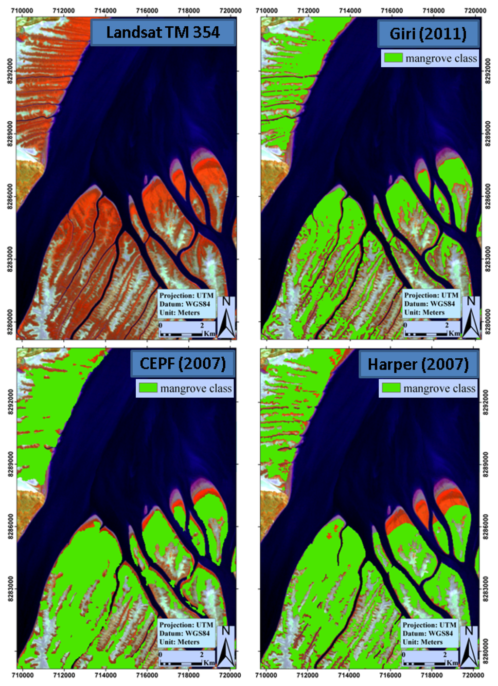 A Landsat TM Blue-Green-Red 354 false color composite from July, 2011 is shown in the top left panel wherein mangroves appear primarily in shades of red. Mangrove coverage from three national data-sets (i.e., Giri []; CEPF []; Harper et al. []) is overlain on the Landsat composite in the three other panels. This comparison illustrates how data produced by Giri [] provide the most comprehensive (in terms of representing actual known mangrove area) and contemporary (in terms of year) mangrove coverage; as is illustrated by the variably represented mangrove covered islands in the middle-right of each panel. The area shown in all four panes is a portion of MHJ.