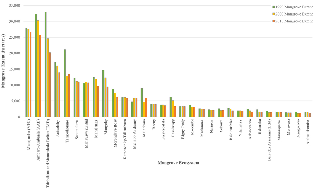 Considered independently, there are nearly 100 distinct, non-contiguous mangrove ecosystems in Madagascar; however, over 200,000 ha (circa 2010) are represented by 30 primary ecosystems, each greater than 1000 ha in size. Of these primary ecosystems, according to the USGS maps, as of 2010, MHJ had the greatest extent (i.e., 26,667 ha), followed by AAB (i.e., 25,664) and TMD (i.e., 20,242 ha) (Table 3; Figure 4). BdA, ranked as Madagascar’s 26th largest mangrove ecosystem, containing 1362 ha as of 2010. The extent in ha for 1990, 2000 and 2010 according to USGS-produced maps as partitioned by primary mangrove ecosystems are provided in Table 3 and Figure 4.