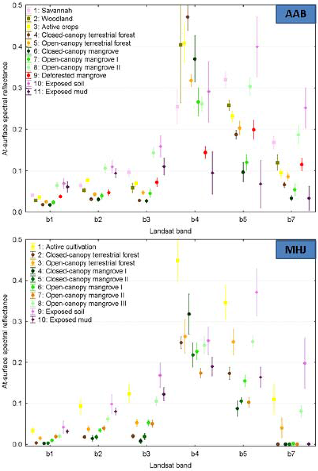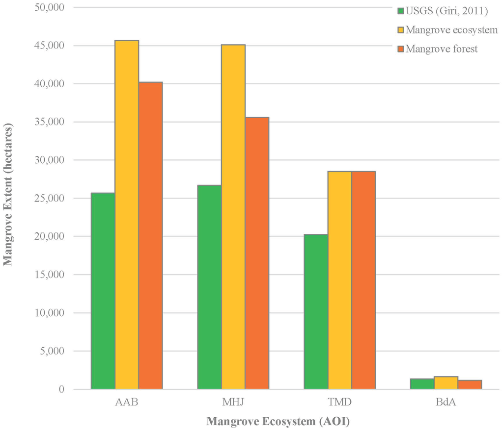 Adhering to the methods described in Jones et al. [] for AAB, and Jones et al. [] for MHJ, to produce initial maps for TMD and BdA, an unsupervised iterative self-organizing classification algorithm (i.e., ISOCLUST) was employed to group pixels in to dominant cover types based on shared spectral properties in bands 1–5 and 7 (i.e., TM and ETM) or bands 2–7 (i.e., OLI). Unsupervised classification for mapping mangroves and closely related ecosystem types is proven, and has produced both preliminary and final maps described in numerous studies [,,,,,,,,,,]. Unsupervised classification results further facilitated masking based on areas dominated by water, cloud and/or shadow. Making reference to existing maps and finer spatial resolution imagery viewable in Google Earth, aggregation and iterative labelling was used to define and refine mangrove and surrounding land-cover types. Mangrove types varied slightly between AOIs, but were based on spectral differences attributable to ecological properties such as canopy-cover, stature and density (Table 2). All mangrove classes represent true mangroves and are assumed to be dominated by salt-tolerant halophytic trees and/or shrubs occurring entirely in tidal and inter-tidal areas []. Mangrove classes dominated by trees are considered forested stands; whereas classes dominated by shrubs/stunted trees do not meet international or national definitions for forest. Herein, the term mangrove ecosystem refers to a contiguous ecological unit containing both forest and non-forest areas of mangrove. Forested classes within a particular mangrove ecosystem are collectively referred to as mangrove forest.
