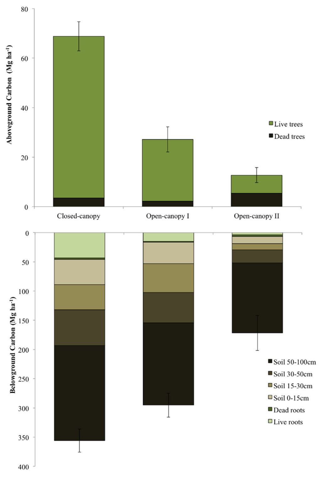 | Sparse terrestrial forest | Mixed-stature terrestrial trees with relatively open canopies interspersed with wooded grassland-bushland | 10 | 5 | 15 | |