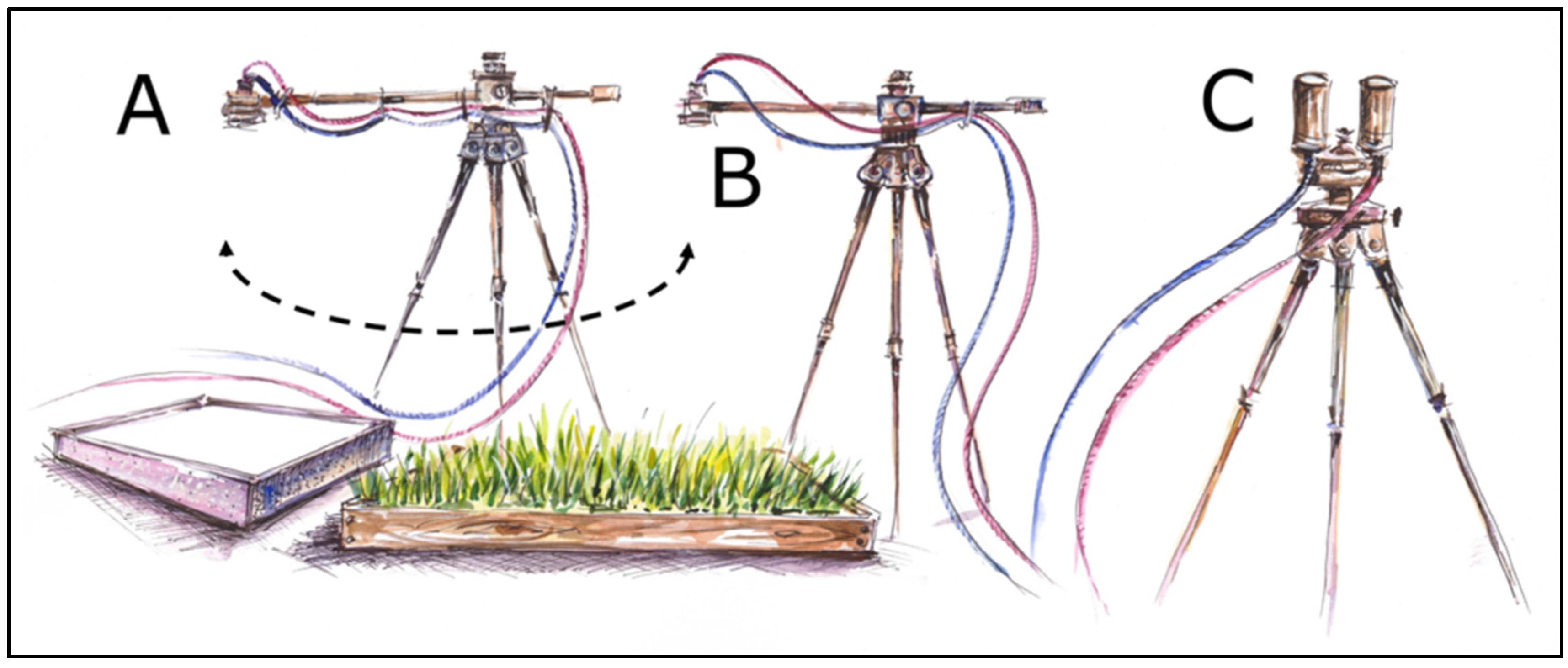 Experimental field setup: (A) The fiber optics connected to ASD Filedspec Pro and QE Pro spectroradiometers are secured to a rotating arm allowing the alternating movement from the white reference panel and the vegetation target; (B) The S-FLUO box downward channels (both HR4000 Narrow Range and HR4000 Full Range) are attached to a fixed tripod looking at the vegetation; (C) S-FLUO box upward channels are horizontally mounted on the third tripod to collect reference measurements.