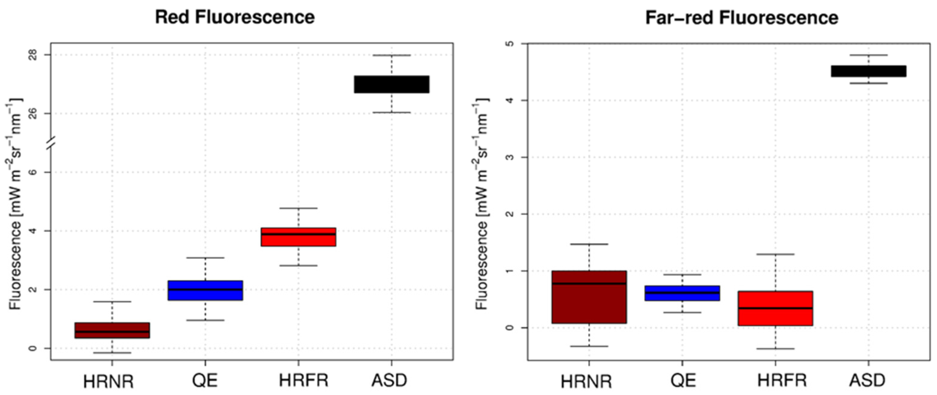 Figure 3 shows the fluorescence values retrieved from the spectroradiometers considered in the study: red (left panel) and far-red (right panel). The average retrievals per band and instrument are included in Table 2. At the far-red band, the QE and the two HR4000 (HRNR, HRFR) spectroradiometers retrieved the same SIF values (from Wilcoxon–Mann–Whitney test, p-value ≤ 0.05). On the contrary, the ASD estimated a far-red SIF value that was six times higher than the mean value estimated using either HRNR, QE or HRFR. Estimates of the red SIF varied considerably among the different sensors, with values increasing in concert with the FWHM per sensor, with the lowest values obtained with the HRNR.