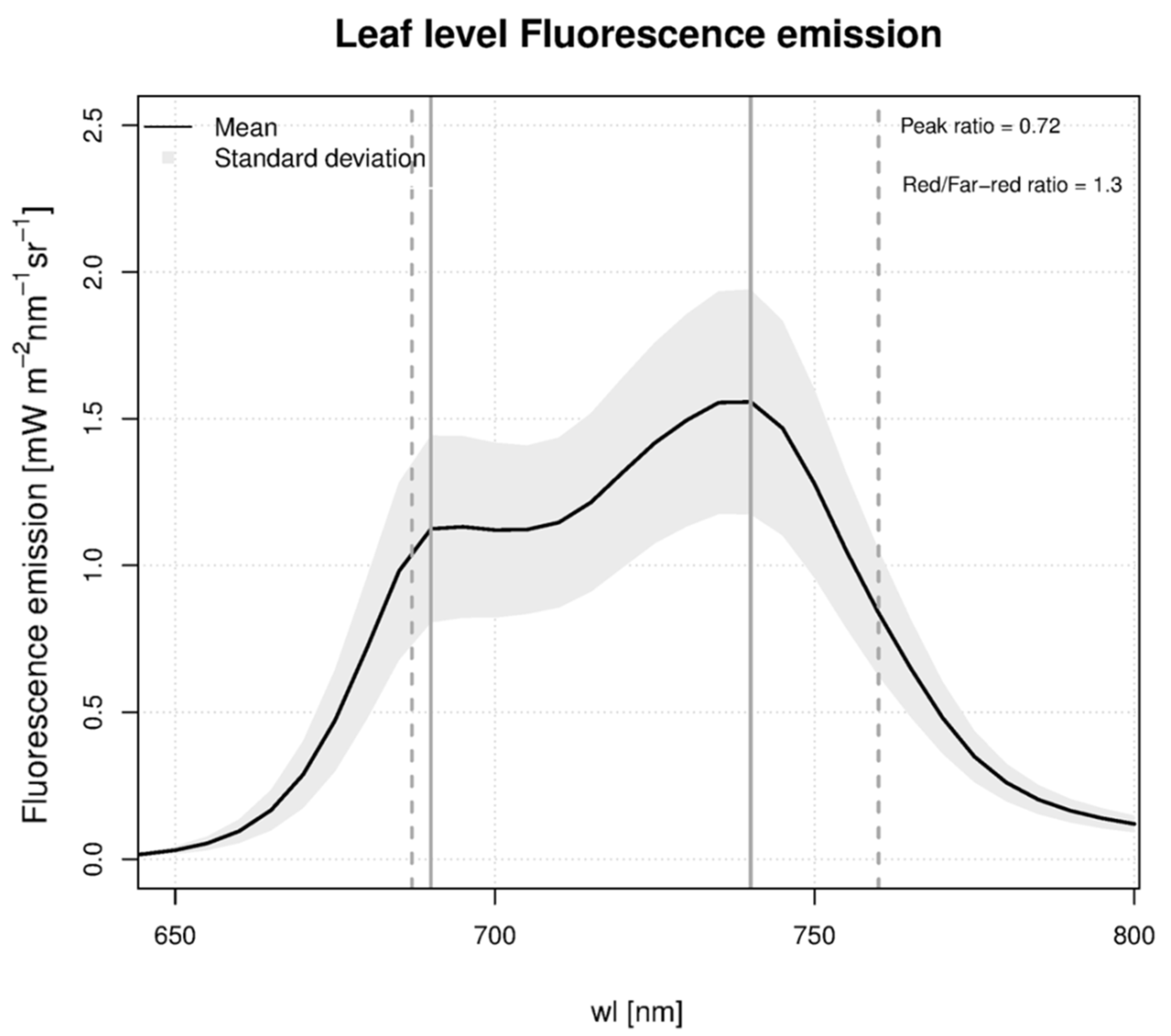 Grass leaf level fluorescence emissions acquired in the laboratory with the SPEX Fluorolog III spectrofluorometer using a 532 nm excitation wavelength. The red peak is expected to be partially reabsorbed at the canopy level. The ratio between fluorescence obtained at 689 nm and 760 (red/far-red ratio = 1.3) is used to qualitatively assess the SIF retrievals made at canopy level with the different instruments (see Table 2). Traditionally, the red/far-red ratio is computed with the values at the peaks (690 nm, 740 nm), which would provide a far-red = 0.72. The two solid vertical lines denote the peaks of the red and far-red fluorescence, whereas the dotted lines refer to the wavelengths used for the SIF estimation.