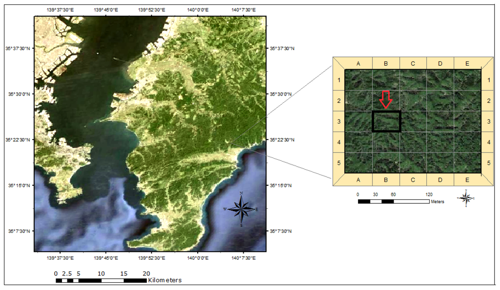 The research area is located at the University of Tokyo Chiba Forest (UTCBF) Prefecture, Japan, located in the south-eastern part of the Boso Peninsula (Figure 1). It extends from 140° 5’33” to 10’10”E and from 35° 8’25” to 12’51”N. The forest is composed of various types of forest stands, including Cryptomeria japonica (L. f.) D. Don, Chamaecyparis obtusa (Siebold and Zucc.) Siebold and Zucc. ex Endl., Abies spp., Tsuga spp., and other evergreen broad-leaved trees. The plot detail is displayed in Figure 2 with the digital terrain model based on the Z-axis measurement. We selected 20 trees for measurement within a pure stand of C. japonica with different diameters, slope, and light.