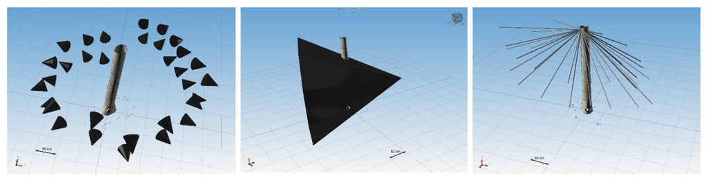 On the left-hand side of Figure 4 are the positions, rotations, and angle of view for every position of a camera around the stem. The middle figure of Figure 4 shows the area of the stem covered by a camera from one position, which was used to calculate the amount of cameras theoretically seeing the point. The right-most figure of Figure 4 shows the connection of a camera with individual points and the reconstructed surface of the stem. Those cameras, from which the connecting line crosses the stem’s surface, are eliminated from the total amount of cameras seeing points.