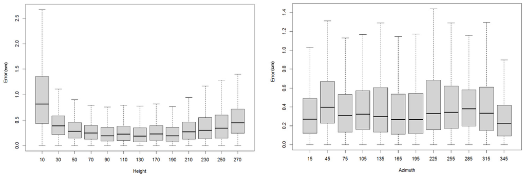 Error (cm) and its distribution with height (left) and azimuth (right).