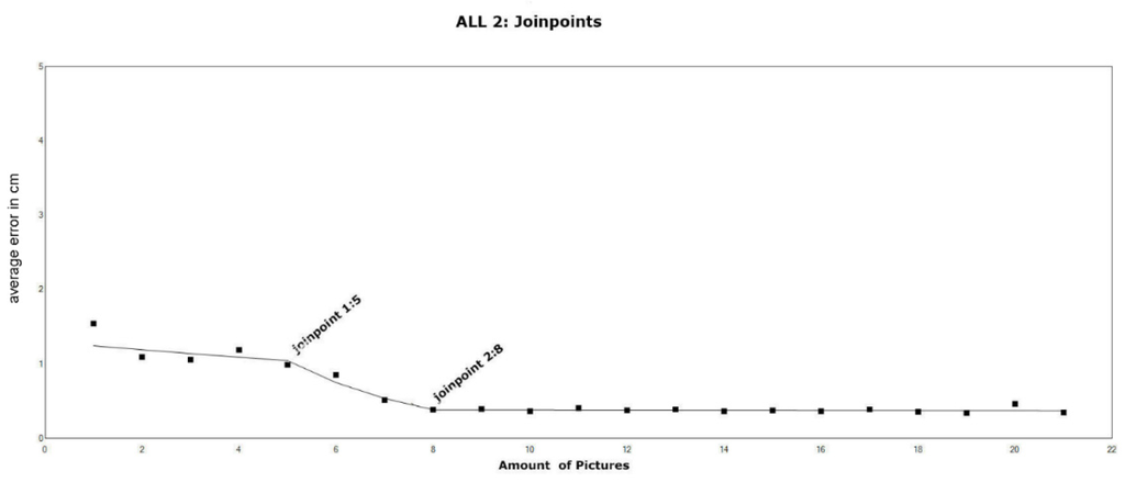 To evaluate the trend of errors associated with the number of cameras, it was expected that the error value would decrease with the increasing number of cameras pointing at the point on the stem, and beyond a certain number of cameras the error would be stabilized. We attempted to identify the ideal number of cameras that would stabilize the associated error of point location accuracy. We used the method by [] to analyze the trend in our data using joinpoint models, which utilizes different linear trends connected at certain points; these are termed as “joinpoints” by the authors. The “Joinpoint Trend Analysis Software” evaluates the trend data and fits the joinpoint model, starting from the minimum number of joinpoints to the user-defined maximum; we used a value of 0 as a minimum and a maximum value of 10. Significance is tested using the Monte Carlo permutations method, and for each number of joinpoints, the software estimated significance values for the amount of joinpoints and for each of the partial linear trends.