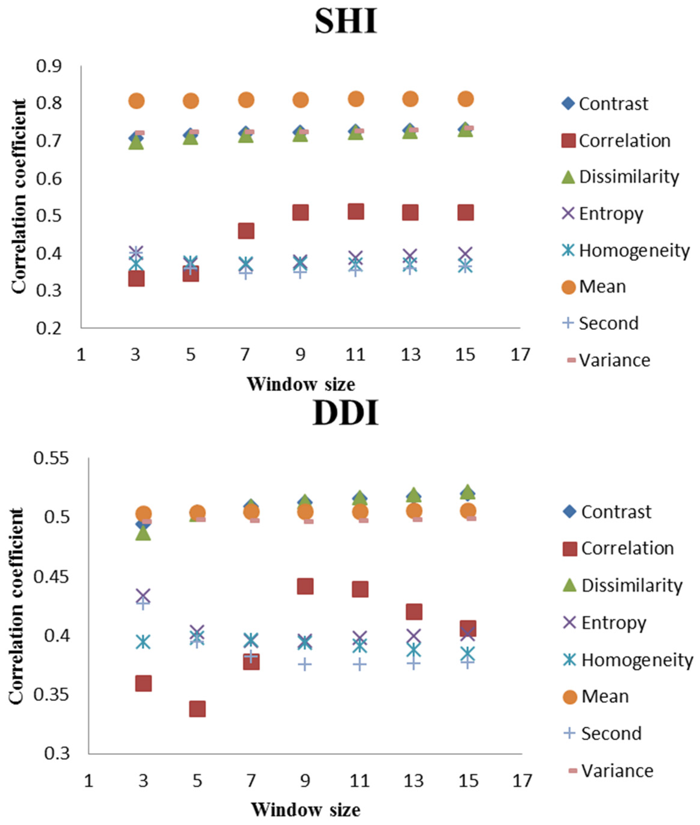 The Pearson correlation coefficient between correlation (a texture statistics) and SHI increased until a window size of 9 × 9 pixels was reached and no further significant improvement was observed when continuing increasing the window up to 15 × 15 pixels (Figure 2). In comparison, the Pearson correlation coefficient between the other texture statistics did not show any notable change along with the window size. Similar pattern was also observed for DDI (Figure 2). The window size of 9 × 9 pixels was therefore determined to be the optimum size to calculate the texture statistics, which was consistent with the findings reported by Shaban and Dikshit [53] and Castillo-santiago et al. [35].