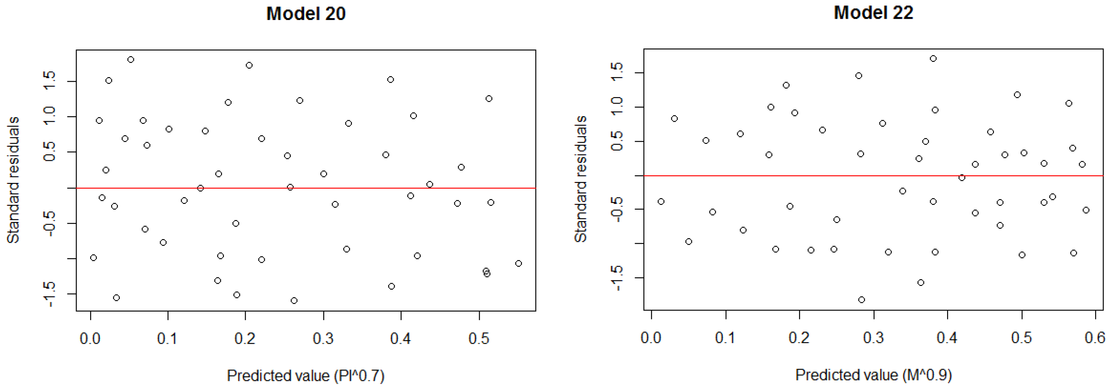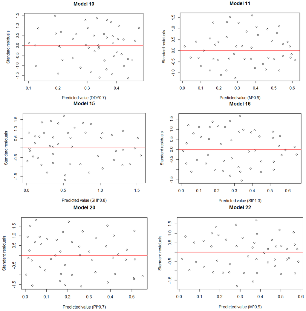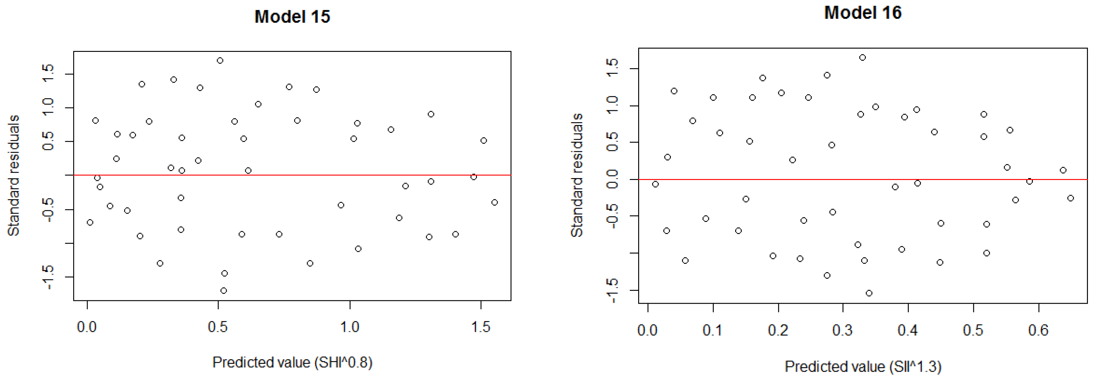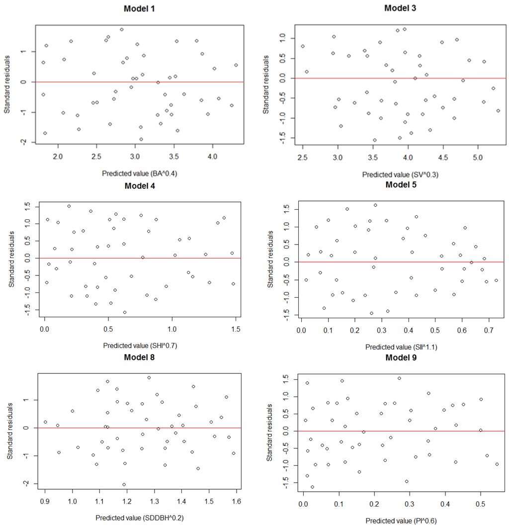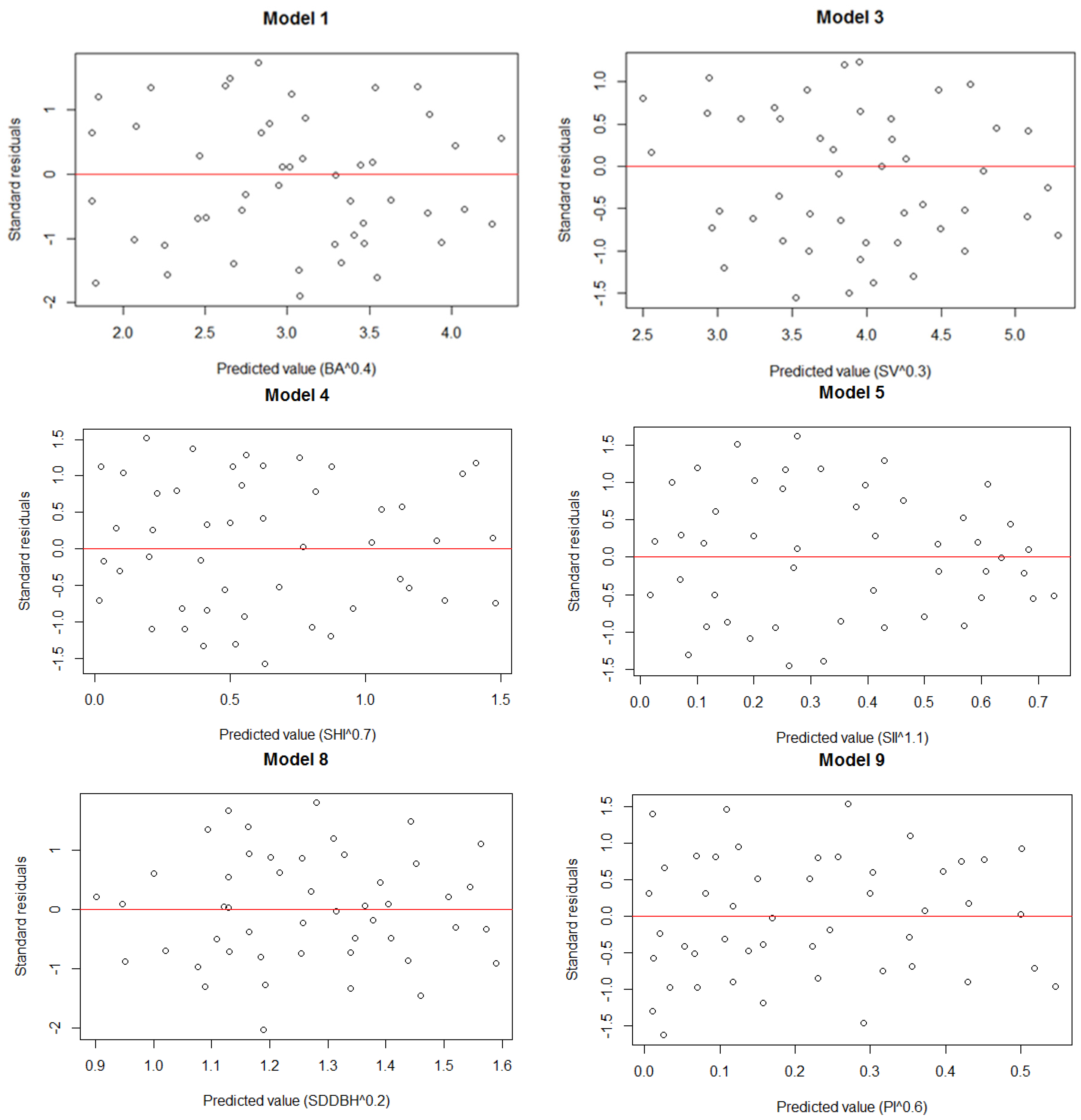 The general fitting statistics including the adjusted coefficient of determination (), and the root mean square error (RMSE) between observed and predicted forest stand variables was computed to evaluate the overall accuracy of the fitted models. In addition, residual plots were produced to inspect the normal distribution of the residuals. For model validation, a ten-fold cross-validation approach was employed to calculate the cross-validated root mean square error (RMSEcv). In this approach, all candidate plots for constructing the predictive models were divided into ten folds. In each iteration, one fold was excluded and the remaining folds were retained for regression. The produced models were used to provide predictions pertaining to the excluded fold. The residuals were calculated for each data point in the excluded data and the corresponding RMSEi was derived. This process was carried out for all folds and the RMSEcv was calculated as the mean of all the RMSEi.