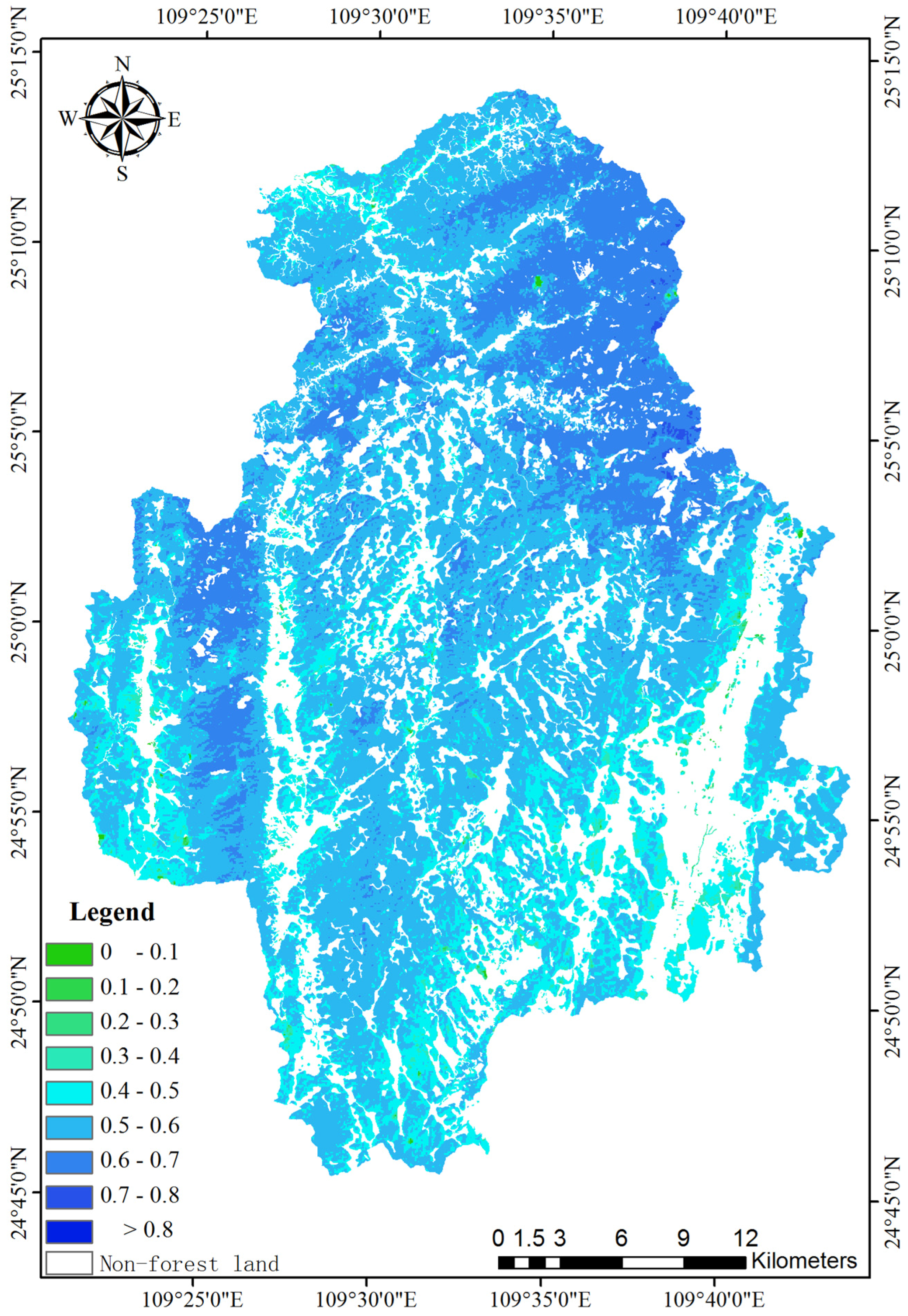 The descriptive forest stand variables derived from the 48 sampling plots are summarized in Table 1. Although the number of sampling plots is only 48, they represent a wide range of forest structural characteristics. For instance, SV, one of the most important conventional forest stand variables, ranged from 21.02 m3/ha to 263.13 m3/ha with a mean value of 101.23 m3/ha, which is almost the same as the average value of 100.20 m3/ha in Guangxi Zhuang Autonomous Region [56]. In terms of species diversity, SHI, for example, ranged from 0 to 1.801, which indicates that the sampling plots contained both single-tree species and mixed-tree species stands, representing a wide range of species diversity. GC ranged from 0.062 to 0.362 with an average value of 0.230, implying a relatively low degree of tree size diversity because the theoretical maximum value is 1. With respect to tree position diversity, the range of from 0 to 0.778 indicated that the stands varied considerably in species intermingling from a very low level to an extremely high level. ranged from 0.470 to 0.531 with an average value of 0.482, implying that in the stands, tree size was moderately differentiated. ranged from 0.273 to 0.706 with an average value of 0.498. Eight plots were uniform distribution ( < 0.475), 16 plots were clumpy distribution ( > 0.517) and 24 plots fell within [0.475, 0.517], representing random distribution.