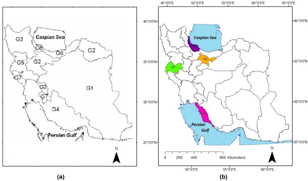 (a) Spatial distribution of precipitation zones of Iran [31]; and (b) Provincial map of Iran and the four selected study regions.
