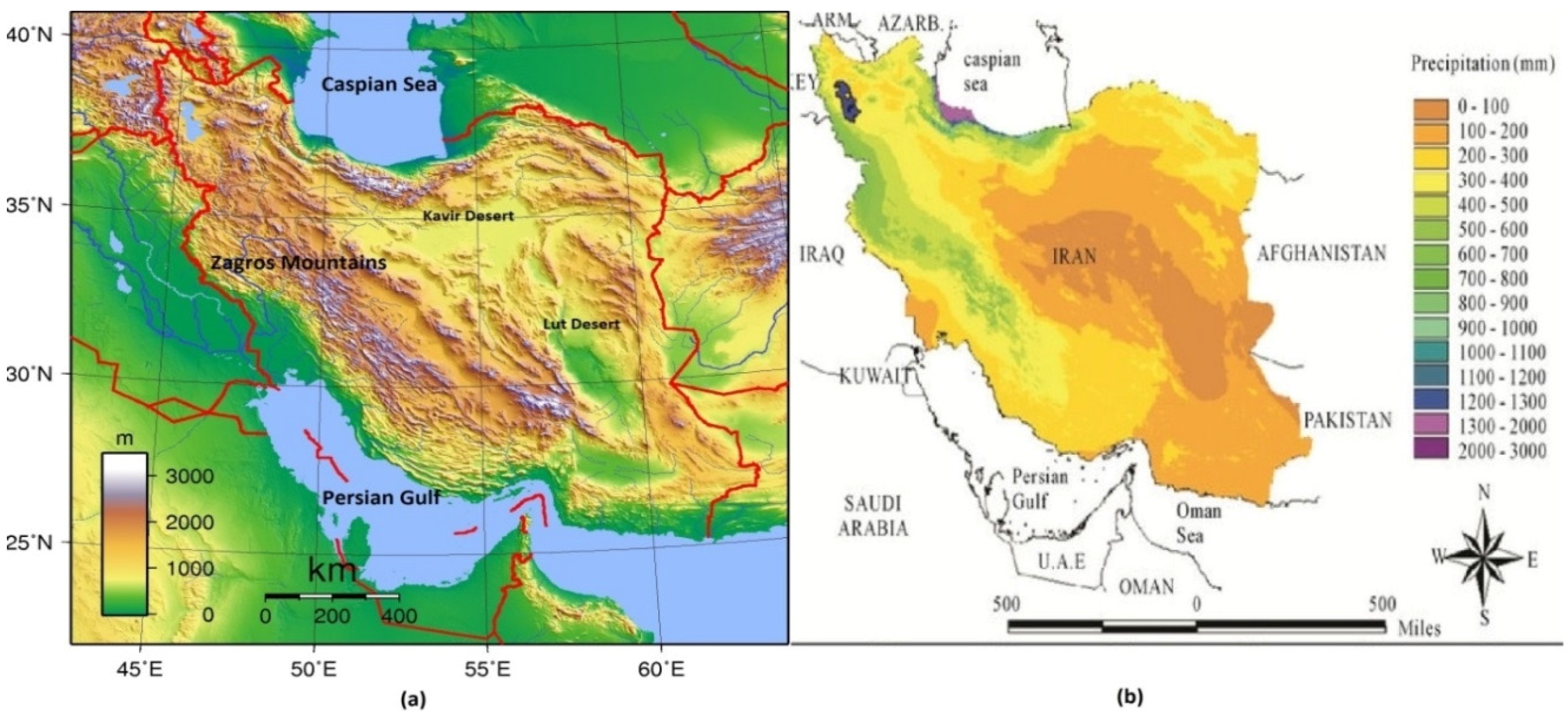 (a) Elevation map of Iran; (b) mean annual precipitation (mm) across Iran, 1961–1990 [11].