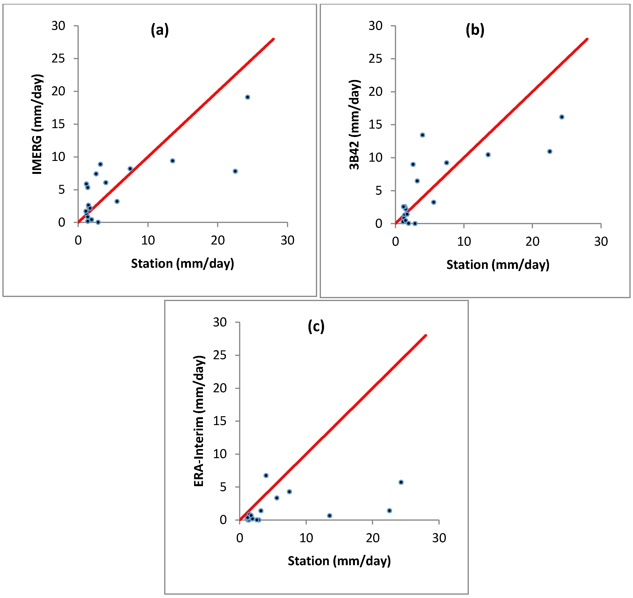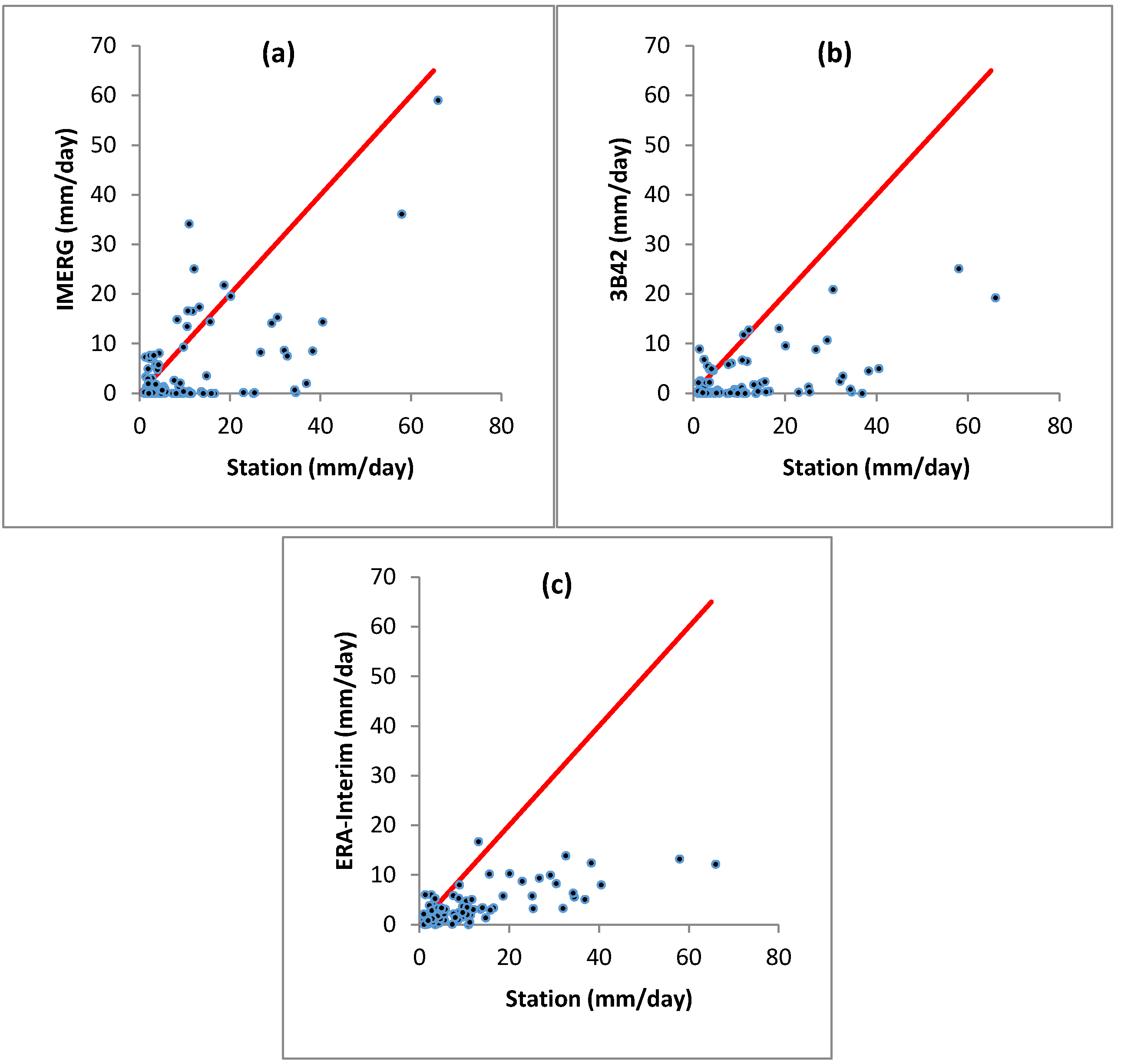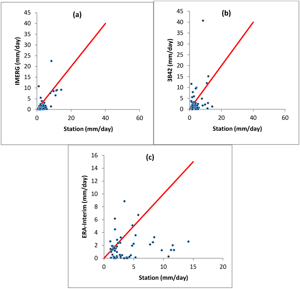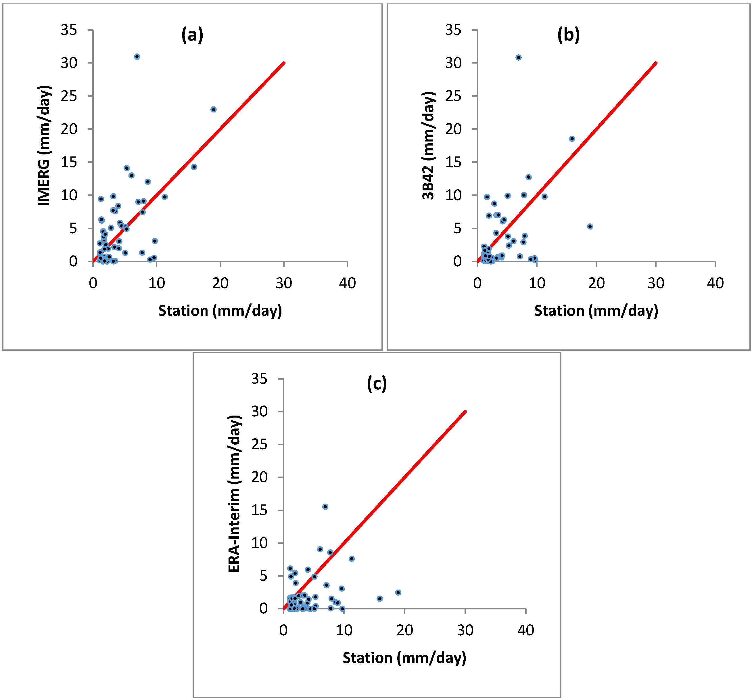 Daily precipitation events scatter plots for Bushehr of IMERG (a); 3B42 (b) and ERA-Interim (c) against gauge data (mid-March 2014 to February 2015).