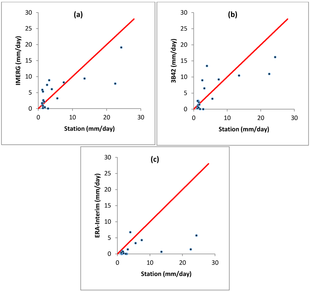 In contrast, for precipitation above 15 mm/day, IMERG indicates better results for POD and CSI in all case studies while ERA-Interim indicates a very weak value (Figure 18a–c and Table 18) that could be due to KuPR (Ku-band (13.6 GHz) precipitation radar) instrument that can detect heavy precipitation.