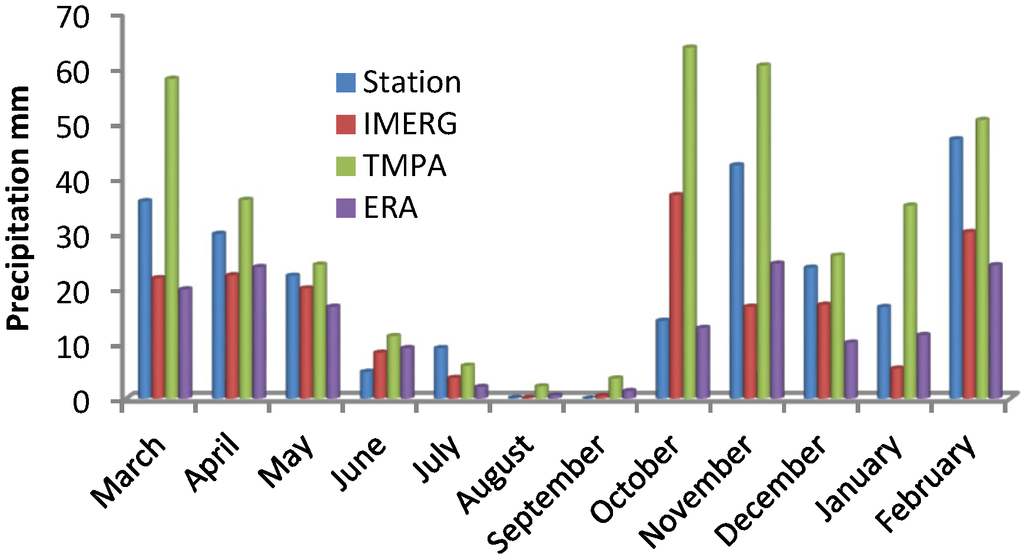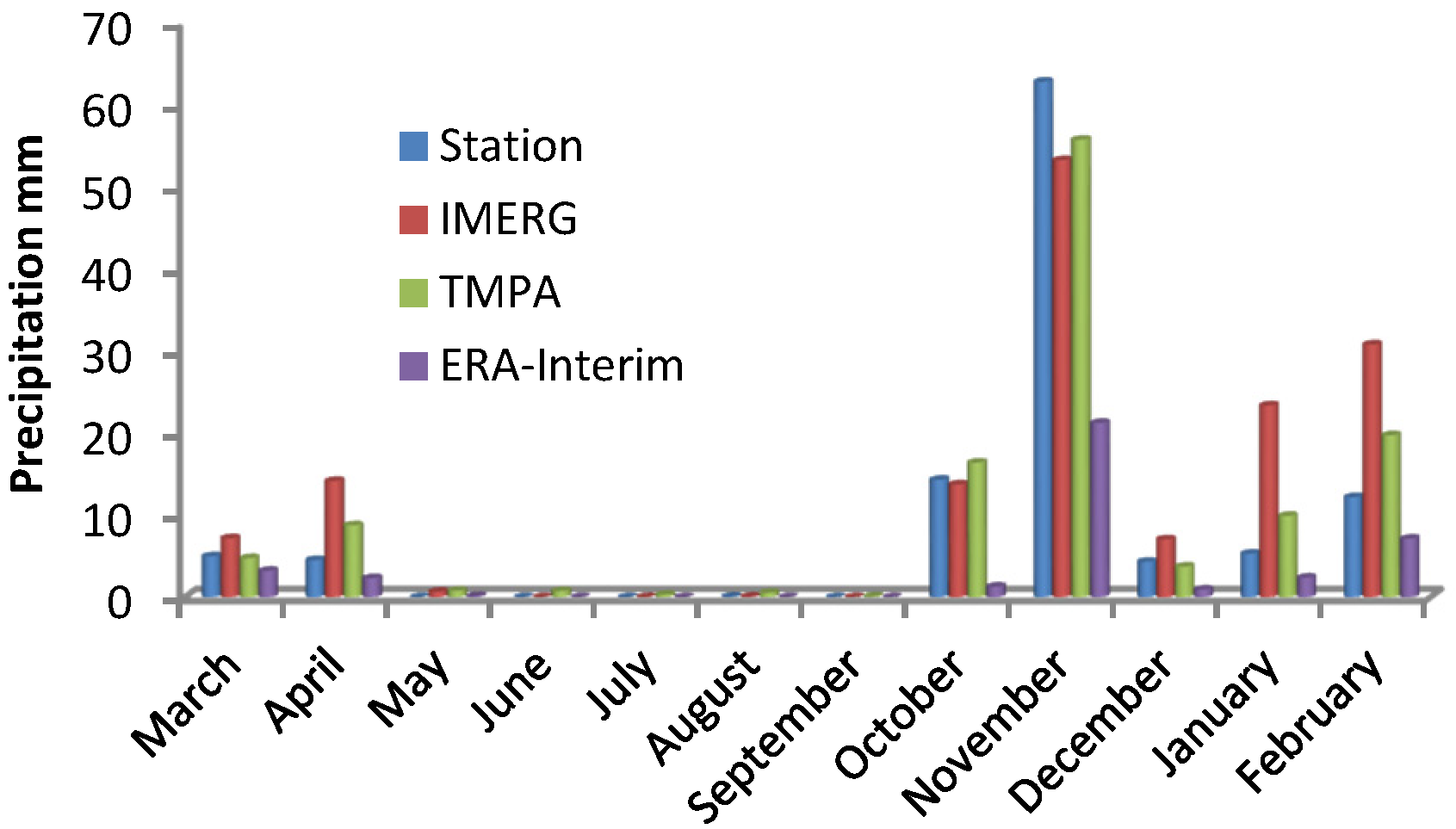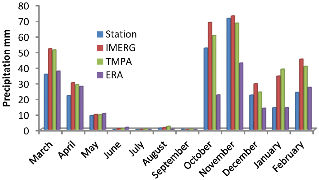 In this study, we used only the in-situ meteorological synoptic stations within the four study areas that have undergone quality control by the Iran Meteorological Organization (IMO). However, the stations with large data gaps were removed. The GPM mission’s Precipitation Processing System (PPS) at NASA’s Goddard Space Flight Center released the IMERG data to the public in late February, 2015. The data set includes precipitation rates since mid-March 2014. Current and future data sets are freely available to users from NASA Goddard Earth Sciences Data and Information Services Center (GES DISC) website [33]. At present, the IMERG data are available from 12 March 2014 to present, thus providing IMERG-V03D data for March 2014 to February 2015 period. The 3B42-V7 from TRMM and other satellites at GES DISC and ERA-Interim data sets from ECMWF [34] are available to the public and are free of charge.