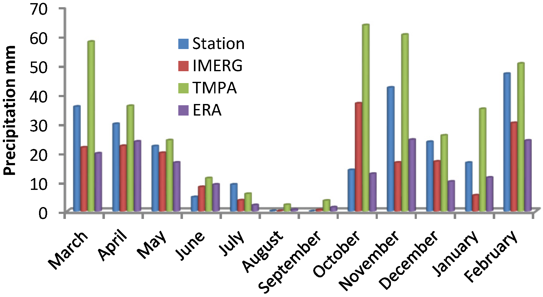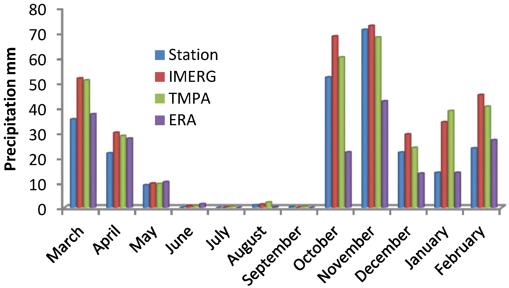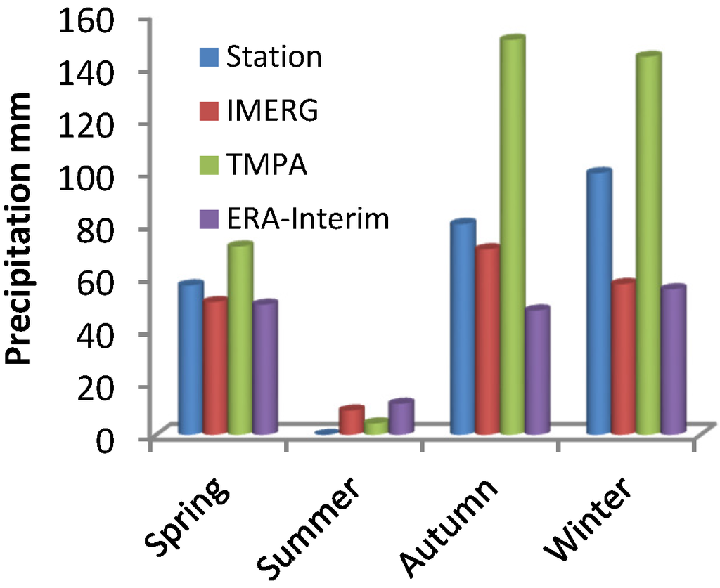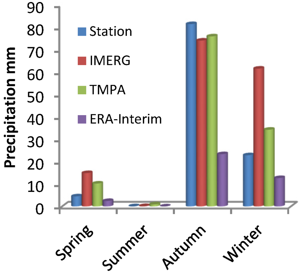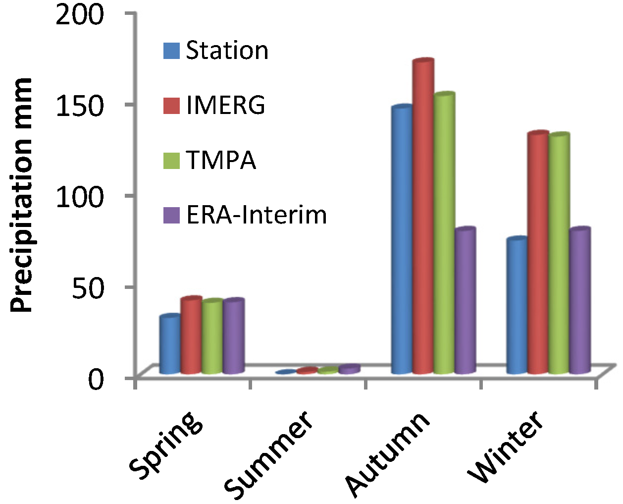 This Study for the first time has evaluated daily, monthly and seasonally precipitation estimates (derived from half-hourly precipitation estimates of GPM constellation satellites (IMERG) and 3-hourly precipitation estimates of TRMM and multi satellite precipitation analysis (3B42)) and ERA-Interim precipitation fields from ECMWF in comparison with the corresponding rain-gauge observations according to four different topographic and climatic conditions over parts of Iran. The evaluation results follow.