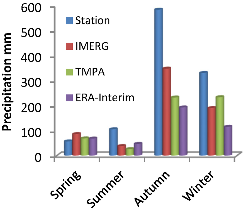 - Located in North of Iran, Guilan region enjoys a humid and subtropical climate. Under this climate condition, ERA-Interim performed reasonably on the basis of POD, FAR, CSI, RMSE and MAE indices on the daily scale. Additionally, the GPM constellation satellites’ product (IMERG) was superior to the TRMM Multi-satellite Precipitation Satellites (TMPA) product (3B42). Moreover, all three satellite/model products underestimated the precipitation in this region, a similar conclusion by Moazzami et al. [13] and Javanmard et al. [11] who tested 3B42 in this region. Such findings may be attributed to local wind and convective precipitation in this region so that satellites could not detect precipitation properly.