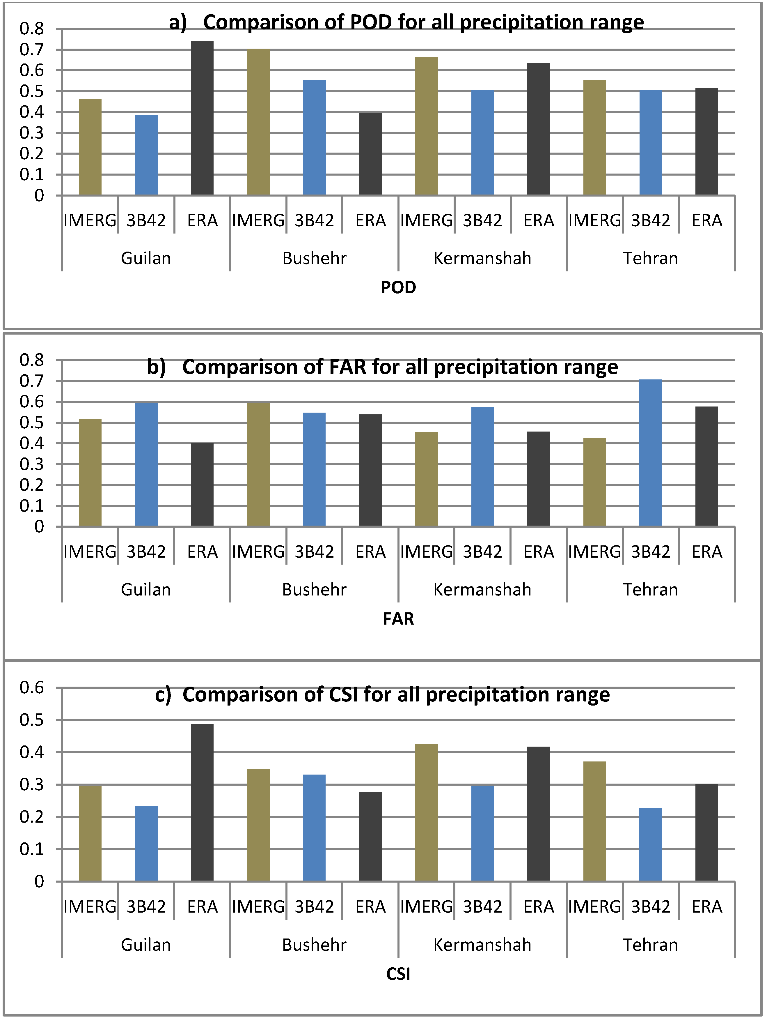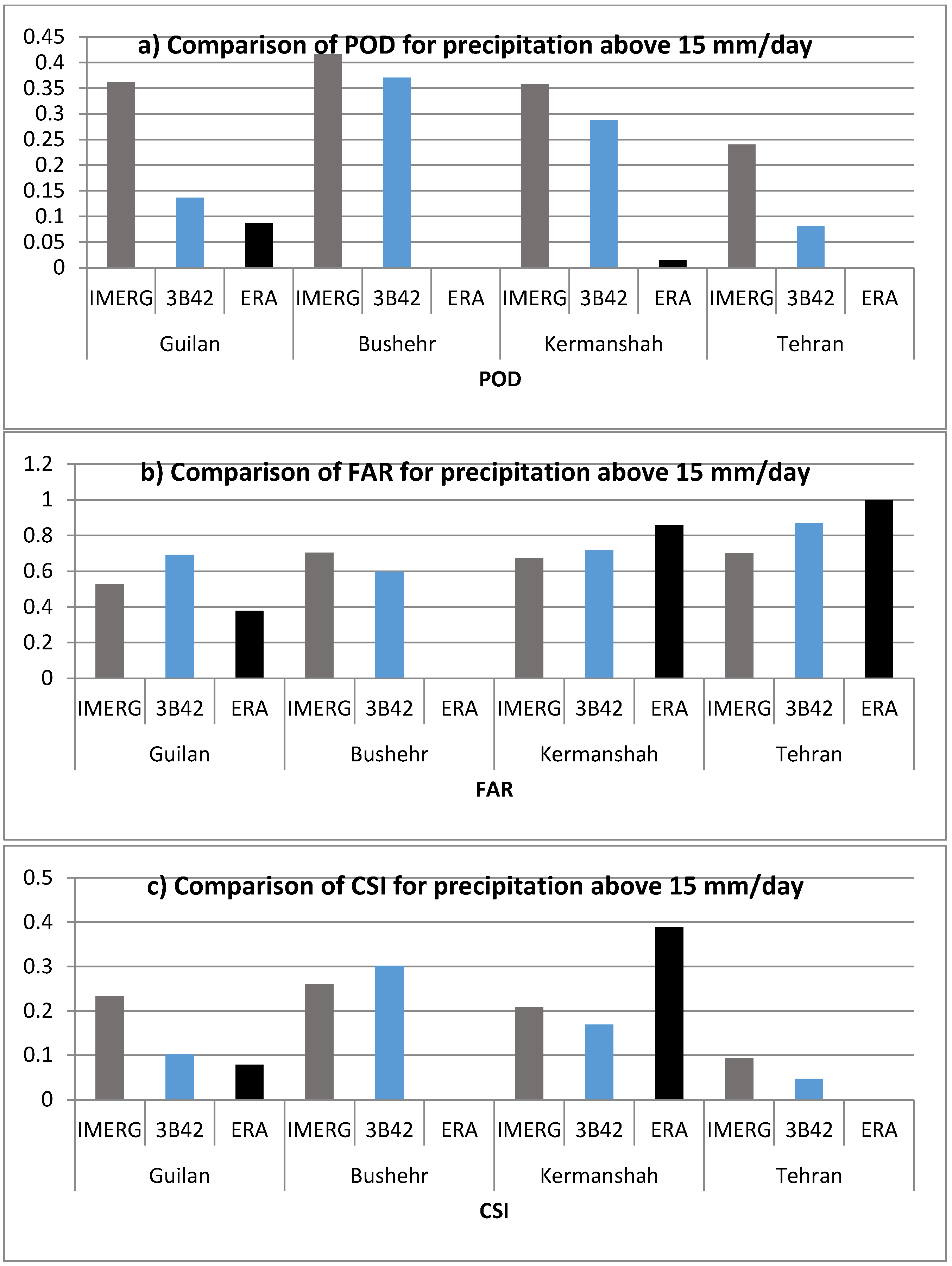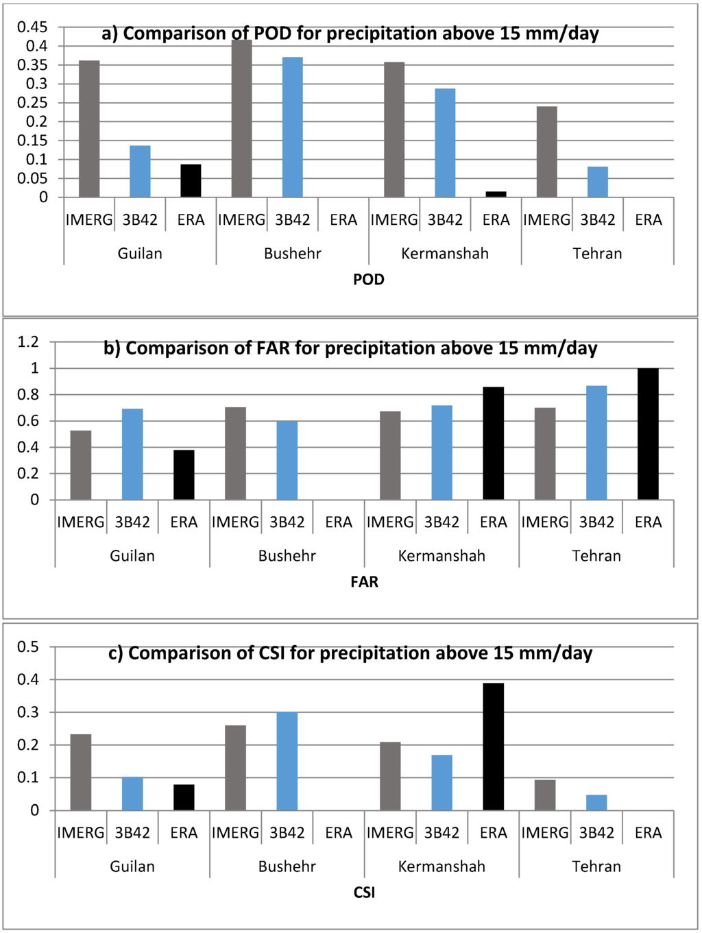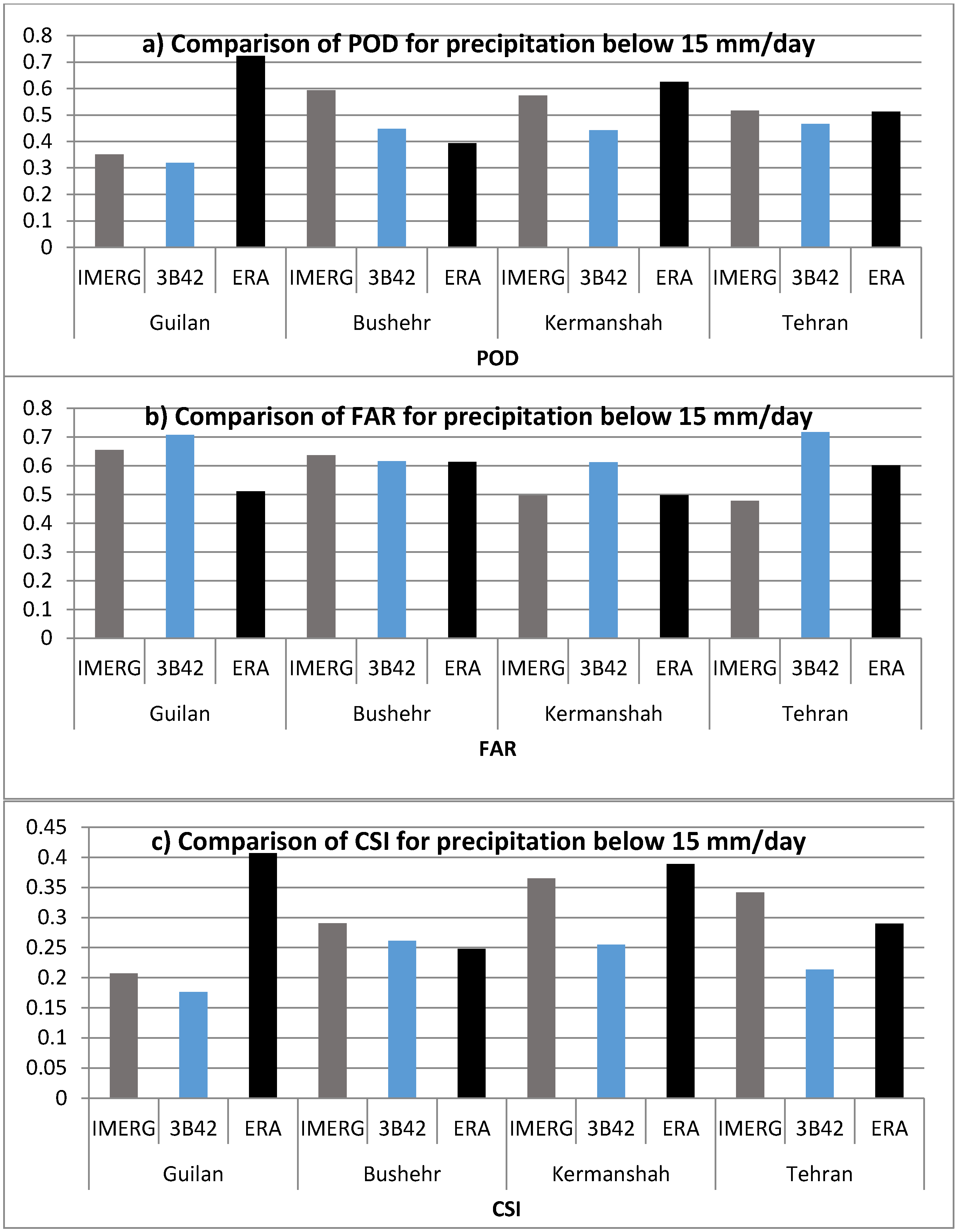 - ERA-Interim yields weak results of POD, FAR and CSI for precipitation above 15 mm/day over Iran while IMERG is far superior to the other products in all study areas. ERA-Interim in Guilan region shows a significant value of POD for precipitation below 15 mm/day.