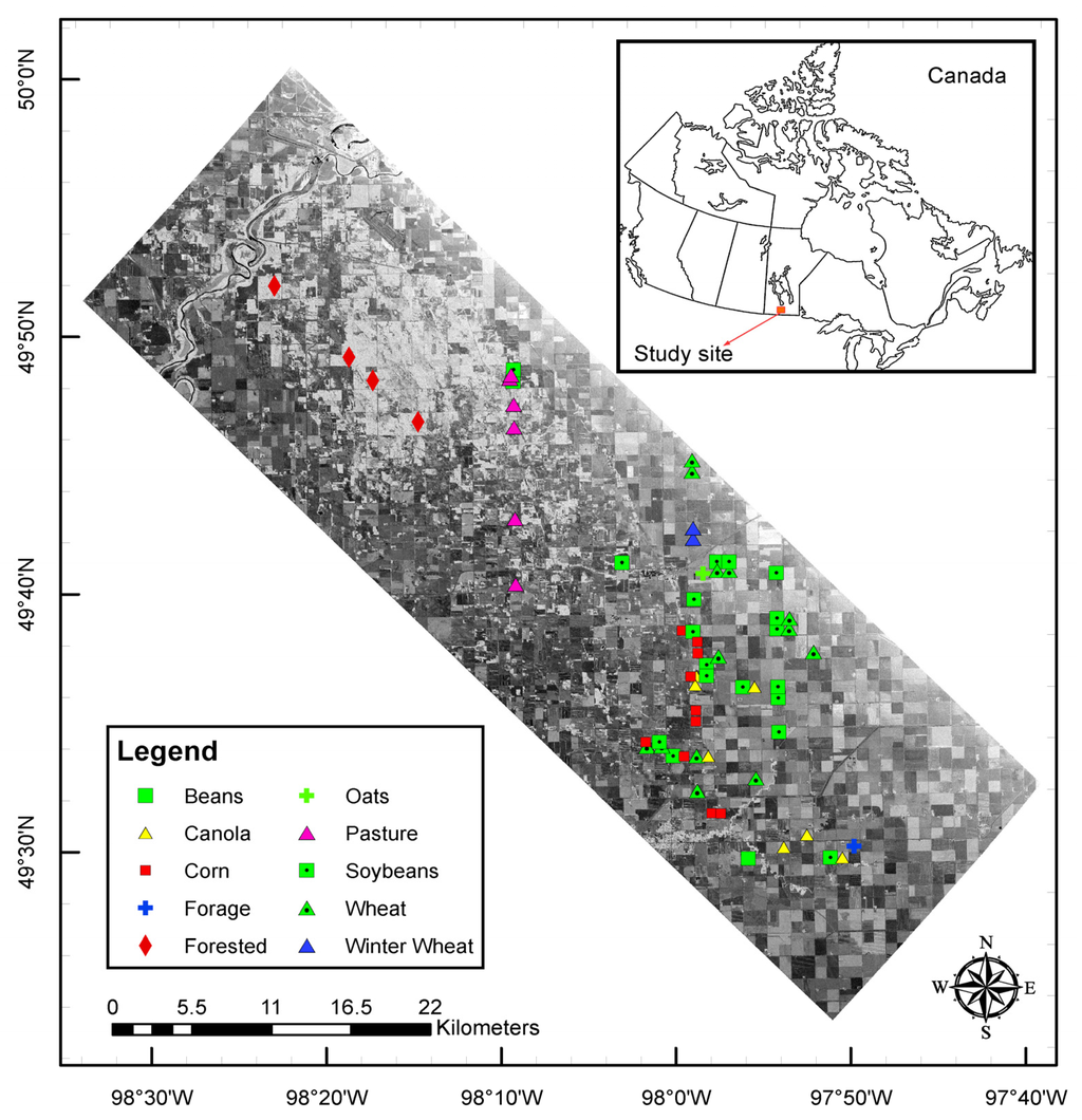 The study site is that of the SMAPVEX12 experiment [18,19] shown in Figure 1. Since SMAPVEX12 is already documented, we only focus on information relevant for the understanding of this paper. For more details on the SMAPVEX12 site and dataset acquisition, the reader should refer to [18,19].