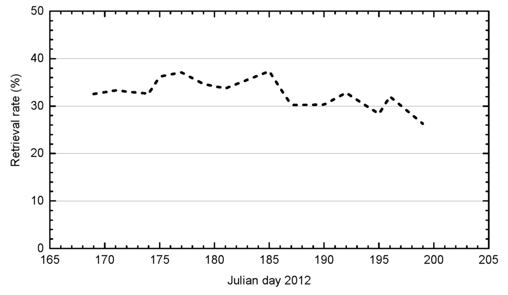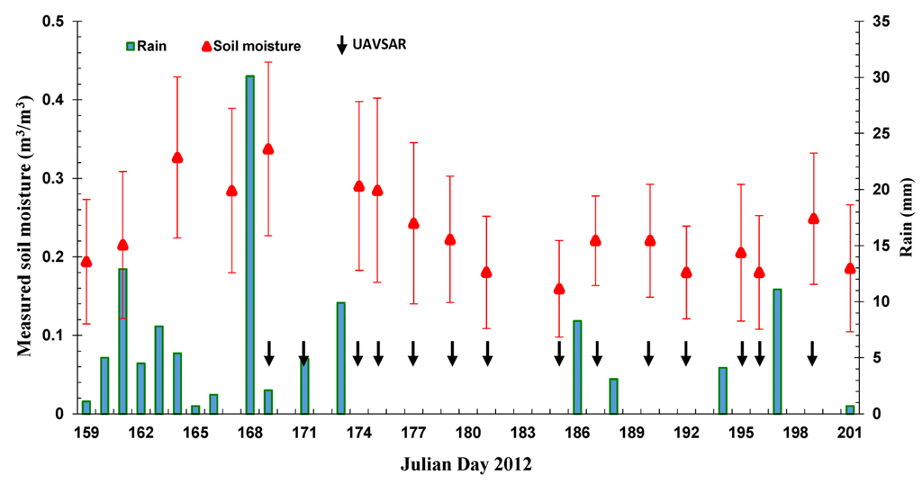 (1) Soil Moisture: Almost coincident with each UAVSAR overpass, the volumetric soil moistures of 55 fields were measured at about 6 cm depth (probe length) using hand-held hydra probes (except for the acquisition on 19 June 2012). Furthermore, the meteorological observations near the test site were simultaneously recorded, providing the experimental conditions for UAVSAR data acquisition and related ground measurements. In Figure 2, the temporal variation of the measured volumetric soil moisture is in agreement with that of the rainfall amount. The peak of the volumetric soil moisture appeared around Julian day 168 as a consequence of successive rain events followed by a significant precipitation of about 30 mm on Julian 168.