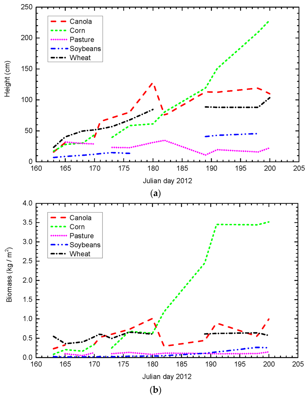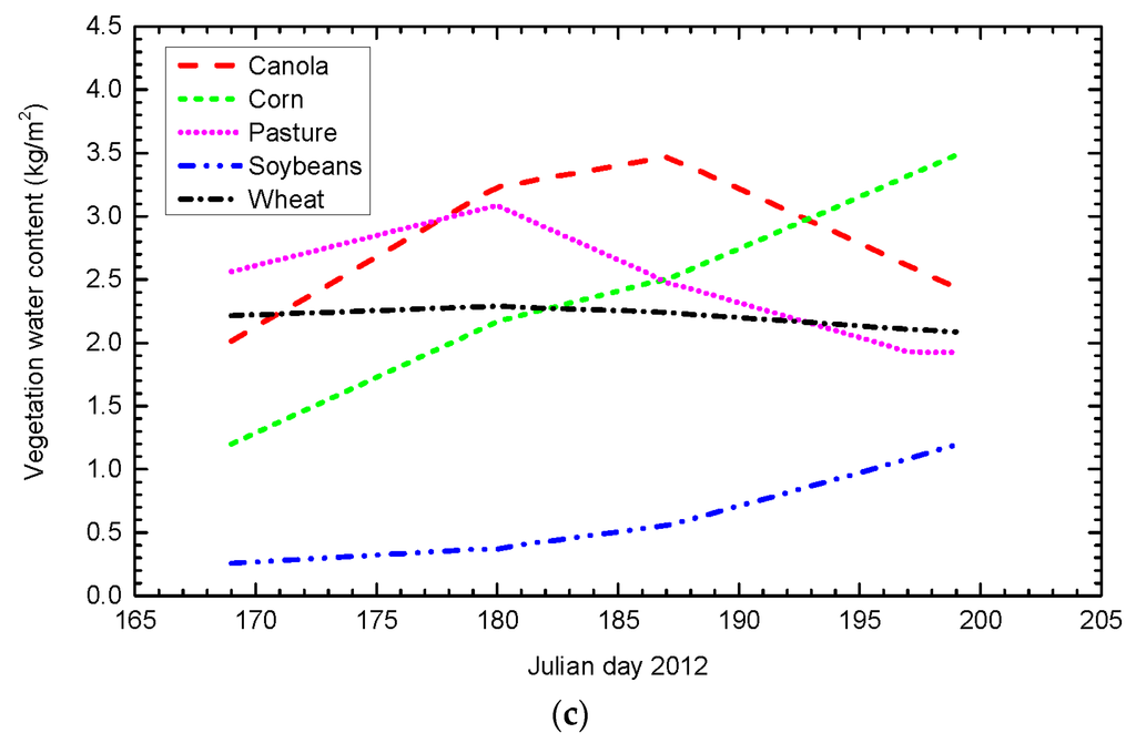 (3) Vegetation parameters: Measurement of vegetation properties was also an important aspect of the SMAPVEX12 campaign with a main focus on representative crops (canola, corn, soybeans and wheat). The vegetation height and biomass were measured for analyzing the vegetation effects on the L-band microwave signal and subsequently on soil moisture retrieval. Besides, in a post campaign activity, maps of the vegetation water content over the SMAPVEX12 site were derived from SPOT-4 and RapidEye data with an accuracy ranging from 0.13 kg/m2 to 0.80 kg/m2 depending on the crop types [21]. For the illustration, Figure 3 shows the measured vegetation height and net wet biomass [18] and the derived vegetation water content [21] of representative crops for the phenological stage considered in this study.