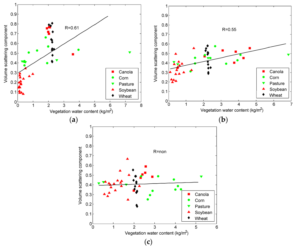 Correlation analysis of vegetation water content and volume scattering component for Julian day (a) 169 (17 June 2012); (b) 185 (3 July 2012); (c) 199 (17 July 2012).