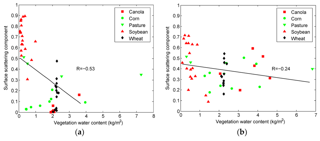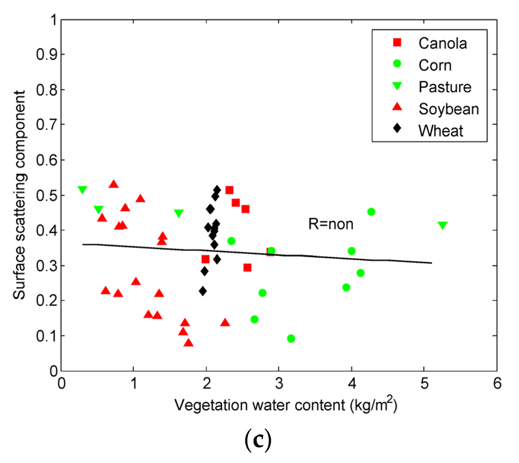 Correlation analysis of vegetation water content and surface scattering component for Julian day (a) 169 (17 June 2012); (b) 185 (3 June 2012); (c) 199 (17 July 2012).
