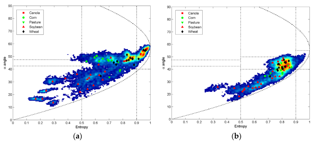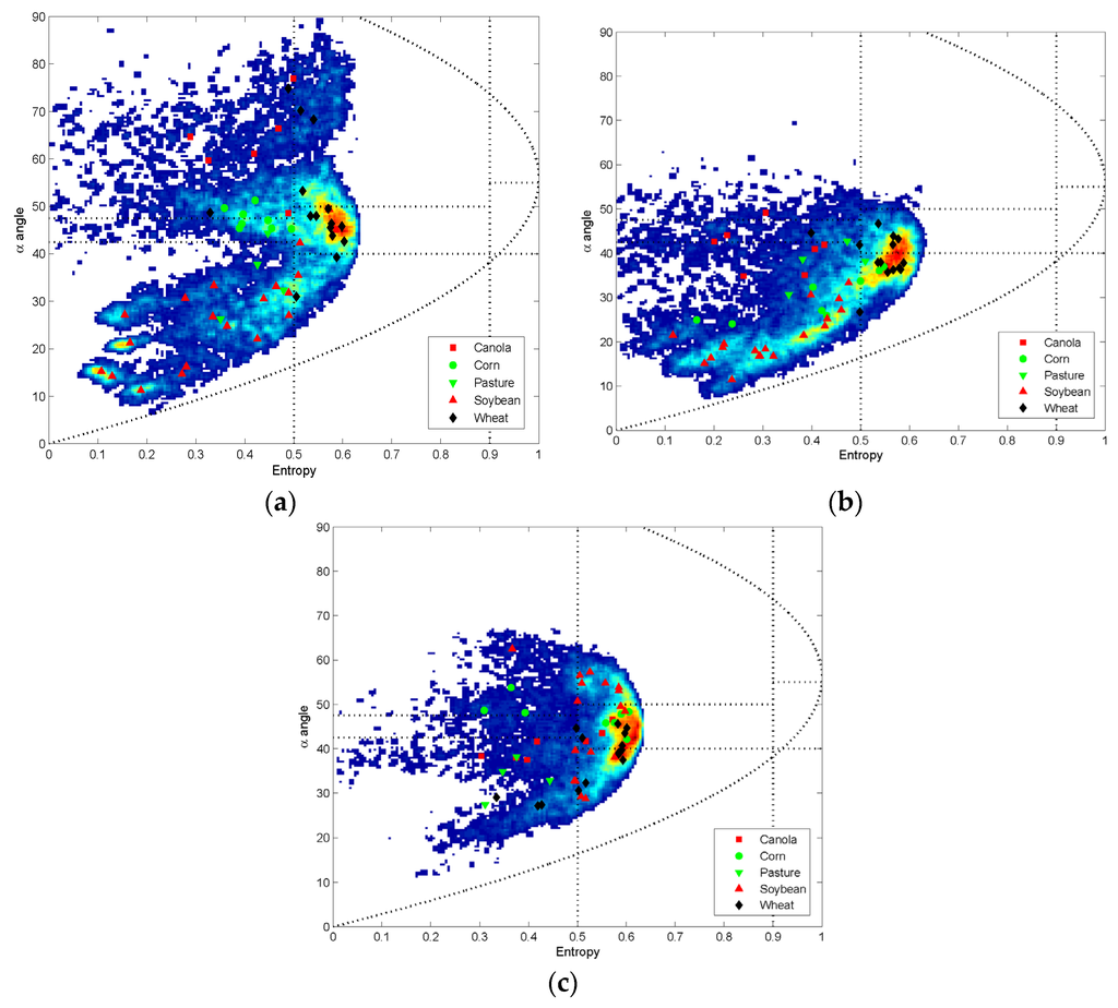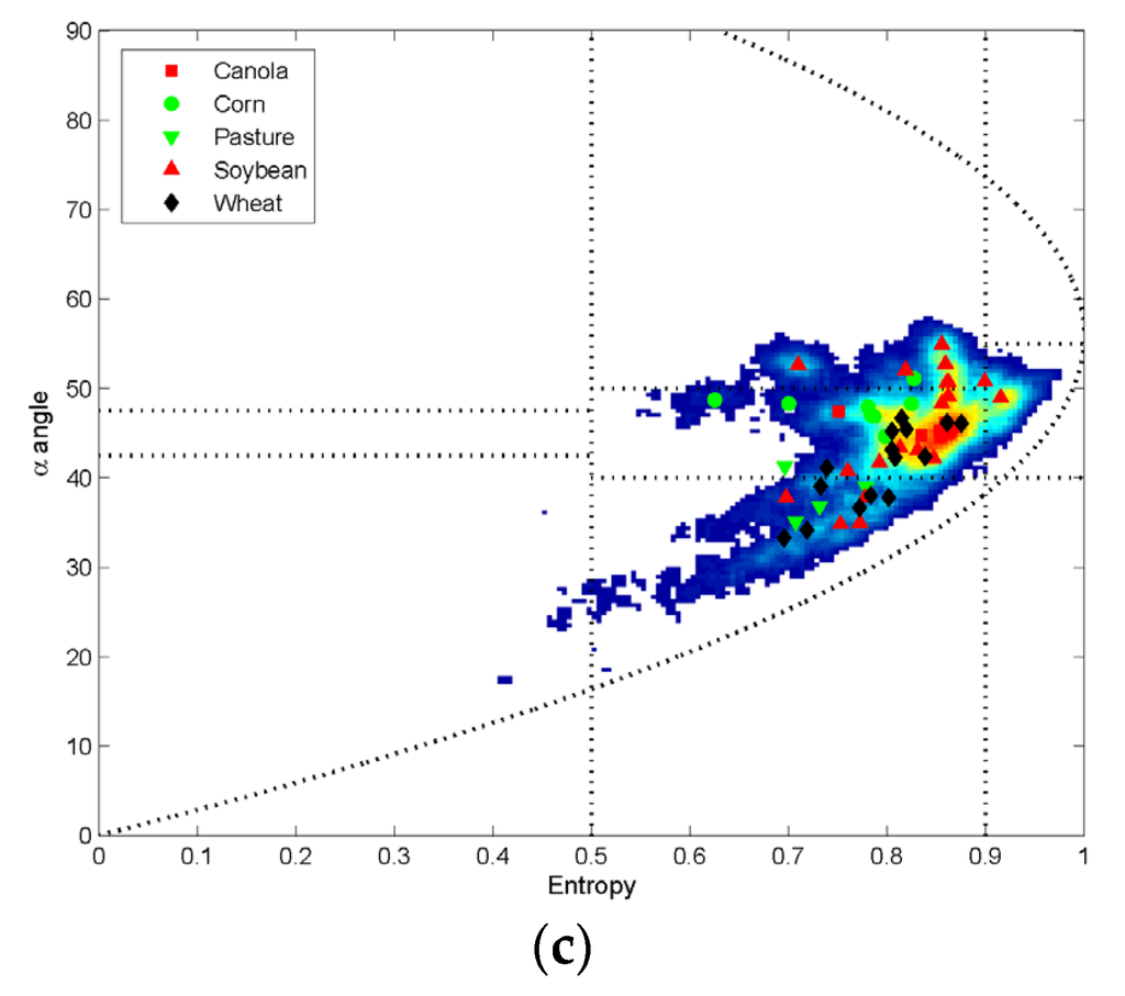 Comparing Figure 9 and Figure 10, a decrease in entropy values clearly appears for all crops. This result is expected since the remaining ground coherency matrix [Tg] used to generate the Figure 10 represents the surface and dihedral scatterings, and consequently provides lower entropy than the results (Figure 9) obtained from the measured coherency matrix [T3]. Nevertheless, in Figure 10, some of the scattering α angles which are still located within the dipole/volume scattering region are probably related to the residual volume scatterings. These can be explained not only from the limitation of this polarimetric decomposition algorithm using fixed volume orientation cases, but also from the strict narrow criterion on α angle. Indeed, α angle used to characterize the scattering mechanisms stems from a purely empirical segmentation of the entropy/α plane [20,25].