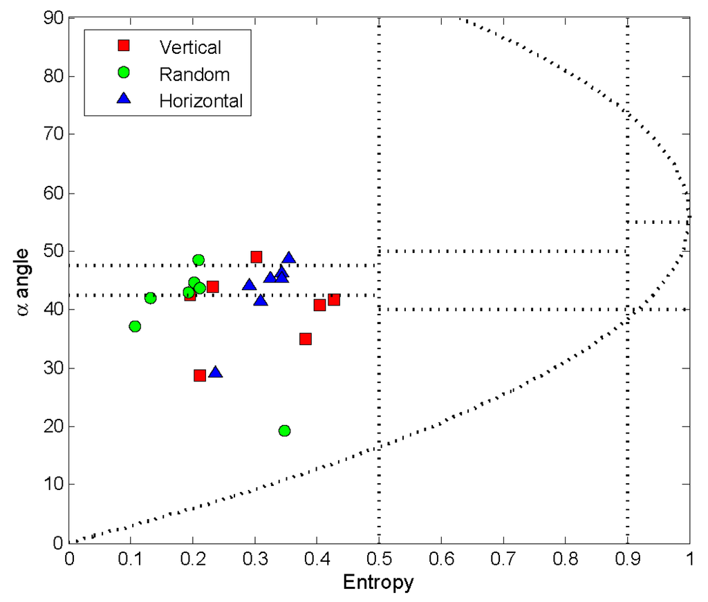 Distribution of canola fields on entropy/α plane after the removal of volume scattering component on Julian day 185 (3 July 2012) for three vegetation orientations (vertical, horizontal and random).