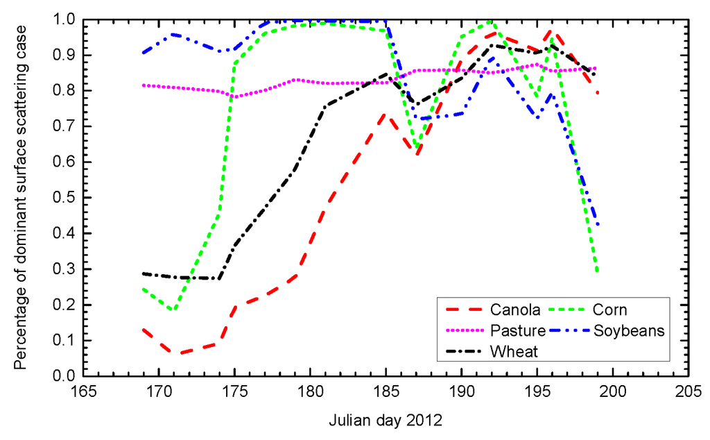 (1) Percentage of dominant surface scattering after removing the volume component: In order to ensure both the retrieval accuracy and spatial inversion rate, a given field was selected for soil moisture inversion, if more than 10% of its area was covered by pixels satisfying the dominant surface scattering criteria. Since for canola, corn and wheat’s fields the dominant surface scattering cases were low at the beginning of the campaign (Figure 12), thresholding the dominant surface scattering cases at 10% allowed retrieval of the soil moisture for almost all the crops. However, as the soil moisture retrieval algorithm is a simplified one, which is only based on the dominant surface scattering, the accuracy is compromised in the conditions of the highly dominant dihedral scattering component. Consequently, for these fields characterized by more than 10% of dominant surface scattering cases, a spatial average of soil moisture was computed from the retrieved soil moisture obtained over the pixels with the dominant surface scattering. Considering Figure 12 which presents the percentage of the dominant surface scattering case for different crop types, the surface scattering component could be used as inputs in the retrieval process, except for canola fields before Julian day 173 (June 21), when the dominant surface scattering case is lower than 10%. Due to the complementarity between the dominant surface scattering and the dihedral scattering component in the remaining signal, Figure 12 also indicates an important dihedral scattering component for canola, wheat and corn from Julian day 169 to 178 (from June 16 to 26). Under such conditions, less performance of the simplified polarimetric soil moisture retrieval algorithm will be obtained, which is mainly due to the over-subtraction of volume scattering contribution.