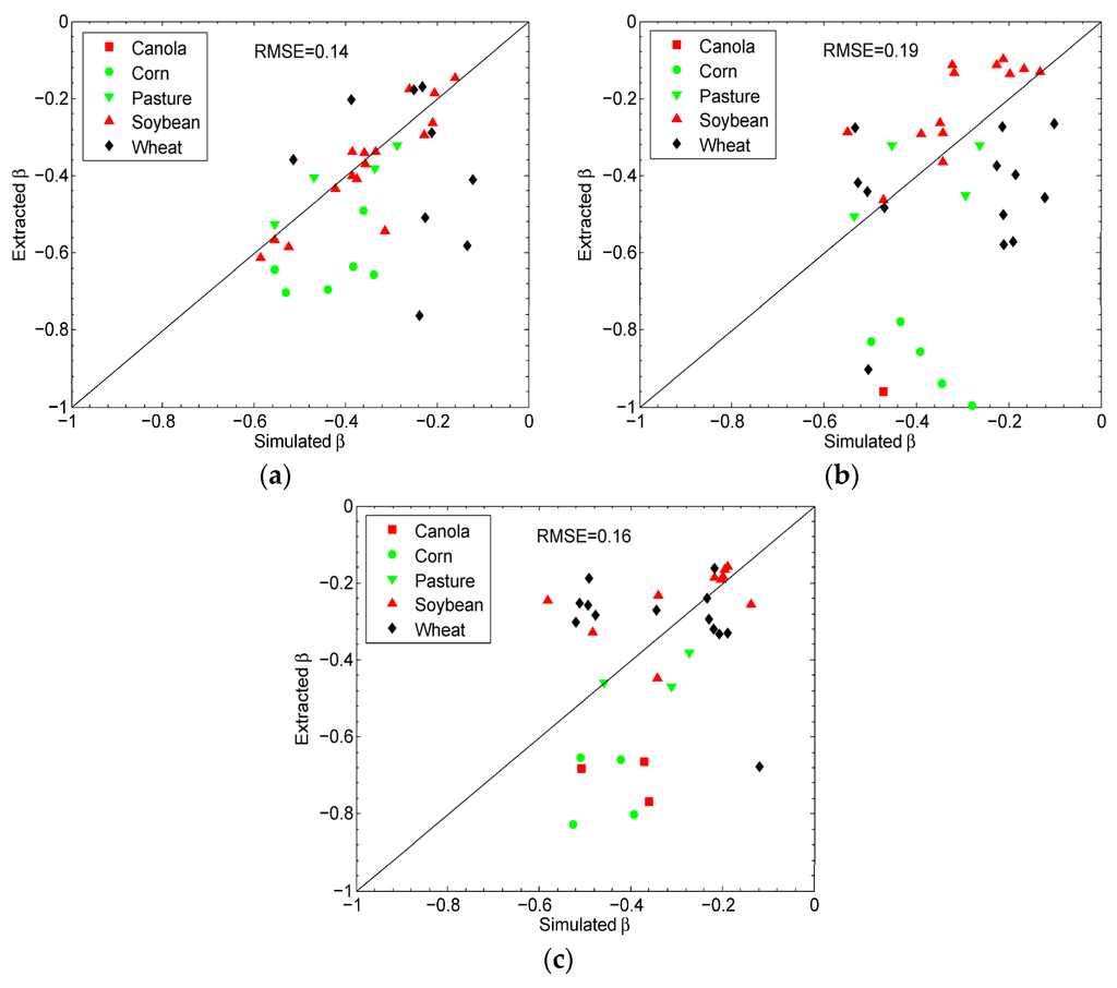 A quantitative analysis is also conducted by comparing the mean values of the retrieved soil moisture on each field with the in situ soil moisture measured during the SMAPVEX12 experiment. However, in agreement with the scattering mechanism analysis (Section 4.2) and β simulation values (Figure 13), Figure 16 shows that better results are obtained over the fields covered by soybean and pasture than those covered by other crop types, especially at the beginning of the campaign. Besides, Figure 16 shows that the canola fields are not invertible for some dates. On Julian day 199, the inversion succeeded over three canola fields (Figure 16c) with an RMSE value around 0.06 m3/m3. For the corn fields, the accuracy of most of the retrieved results is less than ±0.1 m3/m3. As for the wheat fields, it should be noted that the in situ measurements are missed on Julian day 185, thus the comparison with the retrieved results cannot be performed (Figure 16b). Figure 16a,c show that over the wheat fields the results are underestimated mainly due to the bias of β values (Figure 13), which stems from the partial removal of the volume scattering component (Figure 10).