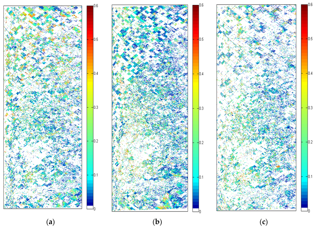 (3) Analysis of the retrieved soil moisture from the surface scattering component: Figure 14 presents the maps of the retrieved soil moisture for the beginning, middle and end of the agricultural campaign, while the invalid pixels are set to white color. Two main reasons can explain these invalid pixels: First, some pixels are characterized by a dominant dihedral scattering after the removal of the volume component. Indeed, in this study, the dihedral component is disregarded due to its ambiguity and disturbance by the wave propagation (the dihedral intensity fd needs to be compensated properly [1,2]) as well as the low improvement in the soil moisture inversion rate that could be obtained. Second, for some pixels characterized by a dominant surface scattering, the corresponding β value is less than −1, which is non-physically correct [1]. However, the range (5% to 50%) of the retrieved soil moisture observed in Figure 14 is in agreement with that of the in situ soil moisture measurements [18]. Furthermore, while some inversion results are provided as field-average values [5], it is interesting to underline the ability of this algorithm to inform about the spatial variability in soil moisture at the field scale (Figure 14). As for the retrieval rate in Figure 15, it varies from 26% to 38% before the mature stage of the crops and then decreases, thereby leading to high amount of white pixels in Figure 14c.