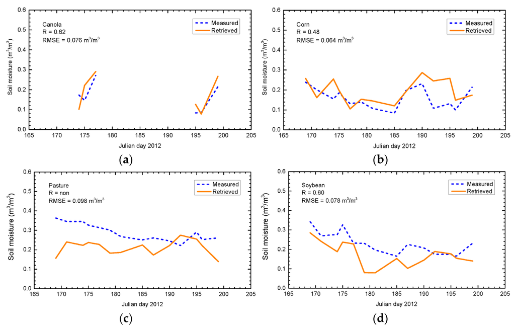 - For the pasture (Figure 17c), RMSE of 0.098 m3/m3 is obtained. However, there is no correlation between the temporal variation of the retrieved and the measured soil moisture. A possible reason may be the large std values of the measured soil moisture over pasture fields (Figure 16). Besides, compared to the agricultural fields, the pasture characteristics are more heterogeneous.