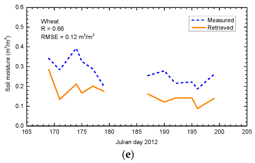 - For the wheat (Figure 17e), the inversion is only achieved for 70% of the investigated period, with a correlation of 0.66 and RMSE of 0.12 m3/m3. Using single polarization ENVISAT ASAR data normalized at 20°, higher retrieval accuracies (RMSE of 5.3% vol. and 6.4% vol., for respectively HH and VV) were obtained by [27] over wheat fields characterized by vegetation water content ranging from 0.08–1.15 kg/m2. Compared to our dataset, both the lower incidence and the lower vegetation water content are very helpful for improving the retrieval accuracy.