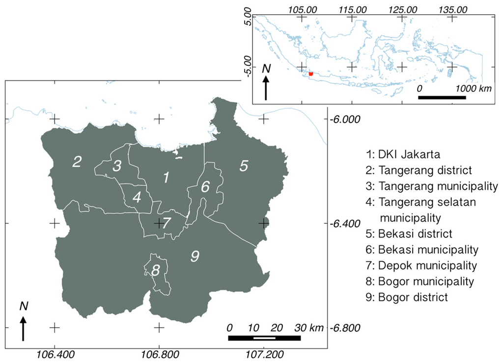 In the JMA, ISA has rapidly increased over several decades [46,47,48]. The JMA includes Jakarta, the capital city of Indonesia, and its suburban area and consists of the capital special province (DKI Jakarta), five municipalities (Tangerang, Tangerang Selatan, Depok, Bekasi, and Bogor) and three districts (Tangerang, Bekasi, and Bogor) (Figure 1). Its population agglomeration is one of the highest in the world [49] and it has experienced rapid urban expansion [46]. This region had a population of 27.2 million people in 2011 [47] and covers a total area of 6659 km2. Although the metropolitan core is located in DKI Jakarta, which is the political and economic center of the country, the population in the suburbs has risen dramatically since the 1980s [47]. While the finance, service and commercial sectors are still concentrated in DKI Jakarta, the manufacturing sector has expanded into suburban areas, resulting in land use transformations away from agricultural land into ISA [47]. The population growth in the suburban areas has been considerable and the urban expansion has been less controlled compared to the DKI Jakarta [50]. As this area is located in a tropical region, high cloud cover has prevented continuous observations of land cover dynamics using widely available optical data.