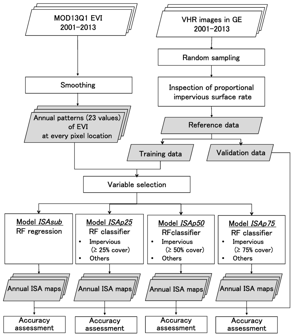 where Area is the total area of ISA, n is the number of pixels estimated as ISA, I was the area of the pixel estimated as ISA, and is the ISA proportion predicted by Model ISAsub. The simple approach of counting the pixels classified as ISAs [13] was utilized for Models ISAp25, ISAp50, and ISAp75. The total amount of ISA in the annual maps produced by each model should not show oscillatory or irregular change [14]. Therefore the temporal trends in total ISA during the period 2001 to 2013 were evaluated using a simple regression approach (e.g., [13]). A flowchart of this overall approach is shown in Figure 2.