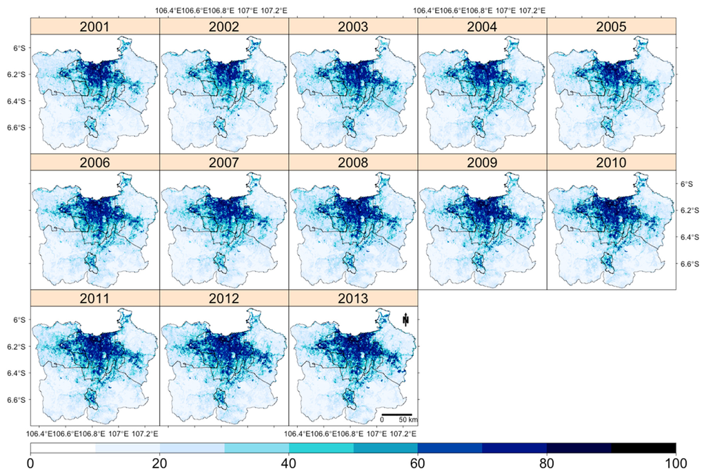 In summary, much research has suggested methods for quantifying annual land cover from multi-temporal data. However, sub-pixel approaches have not yet been applied in multi-temporal analyses to examine ISA despite their frequent use. In addition, pursuit of the highest accuracy of outputs may result in model opaquely parameterised by input variables and whose selection is complex. Therefore, this research produces annual ISA maps along with highlighting: (1) the application of a spatio-temporal sub-pixel classification; (2) the use of tractable input variables into the model; and (3) inconsistent results from per-pixel analyses when using different thresholds of land cover definitions. Using the Jakarta Metropolitan Area (JMA) as a case study, this research develops a sub-pixel classification of ISAs using MODIS EVI data using a RF regression during the period 2001–2013. It is assumed that it would be more insightful to use all of temporal values rather than aggregating them, especially when interpreting the classification of annual patterns of EVI. Thus, all 23 yearly values of the 16-days composite MODIS MOD09Q1 EVI are explored as input variables.