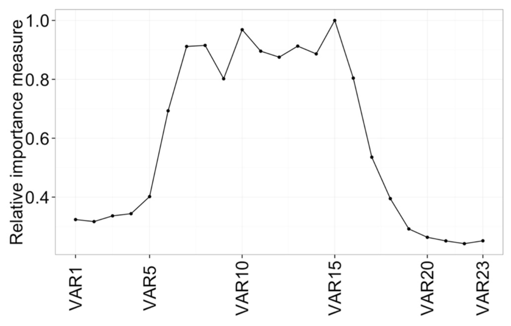 To confirm the influence of each variable importance, relative importance measures of variables were calculated from each importance of variable divided by the maximum measure of importance among all 23 variables for Model ISAsub. Such measures tell the degree of contribution of variables to the model and it helps understanding of the model.