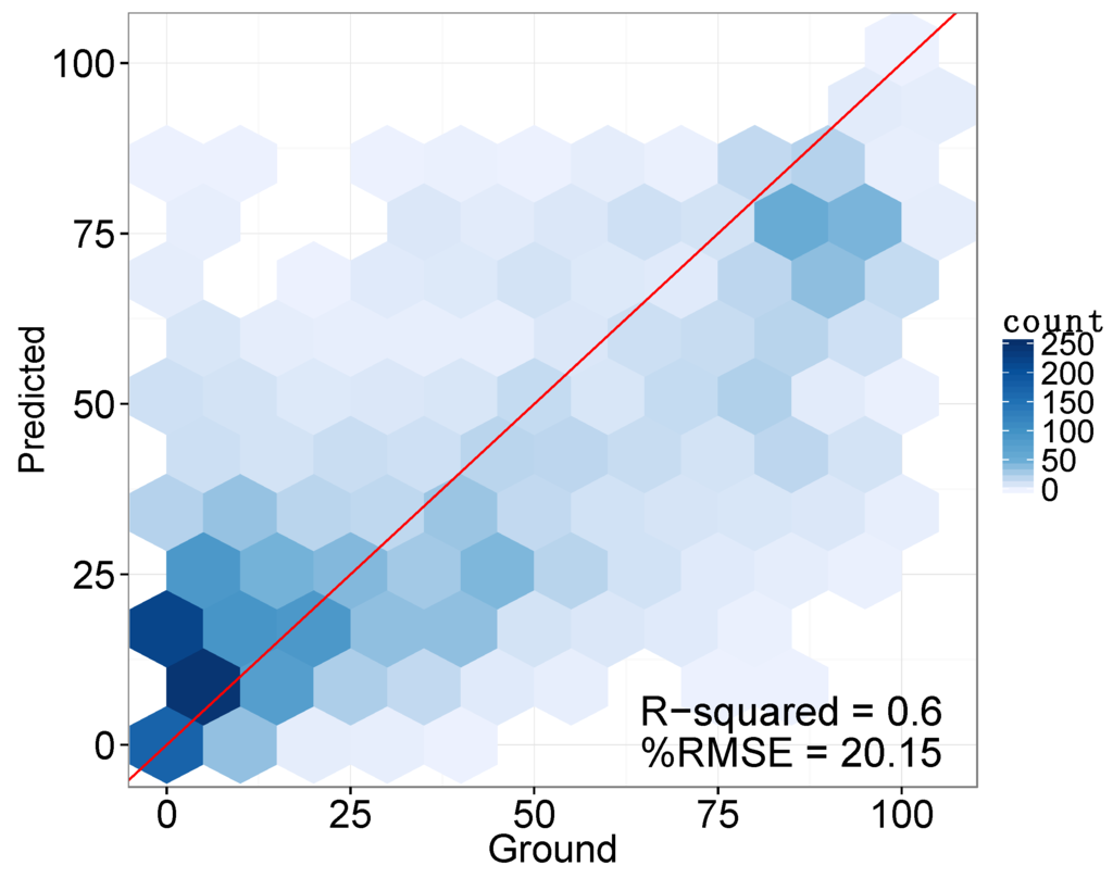 The RF outputs contain assessments of the model performance by OOB error rate for classification. Although the OOB error rate seems to be unbiased [59], several previous studies found such rate often tends to overestimate compared with a holdout validation assessment in some conditions [64,65] and did so in this analysis. It is important that users evaluate the utility of the mapped outputs for their intended applications [66] and thus traditional accuracy assessments were implemented using holdout samples of the validation data. R-squared and the percentage of root mean square error (%RMSE) of the outputs from Model ISAsub were calculated from the validation data as the accuracy measures. For Models ISAp25, ISAp50, and ISAp75, a confusion matrix was constructed and user’s, producer’s, and overall accuracies were calculated. Those assessments are reported as a model assessment and map-based assessment for each.