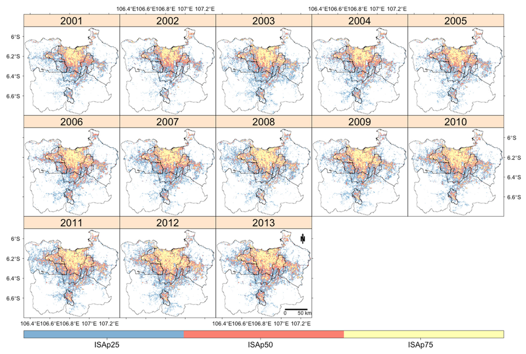 Annual per-pixel ISA maps with over 25%, 50%, and 75% coverage proportion were produced from Models ISAp25, ISAp50, and ISAp75, respectively. These data are overlayed and shown together in Figure 6. It is observed that ISA from Model ISAp25 is widely distributed more than ISA from Model ISAp50, and then ISAp75. As with the sub-pixel classification model in Figure 3, most of the ISA from Model ISAp75 is distributed around the DKI Jakarta and the core of municipalities, while ISA from Model ISAp25 are widely distributed in the peripheral areas. The gradual expansion of ISA over time can be also observed in all models.