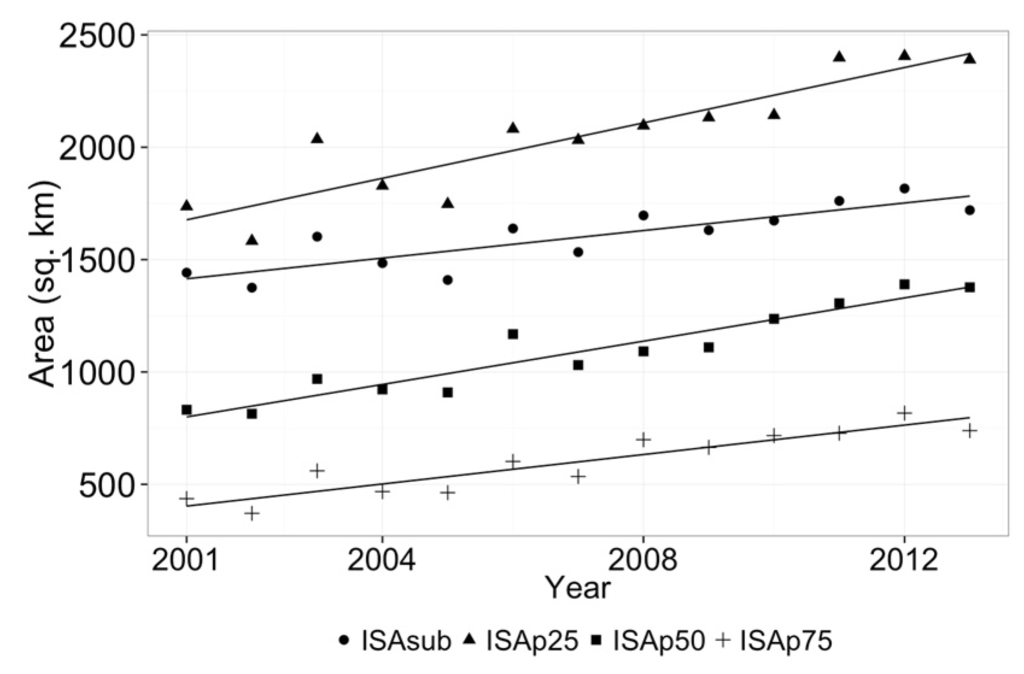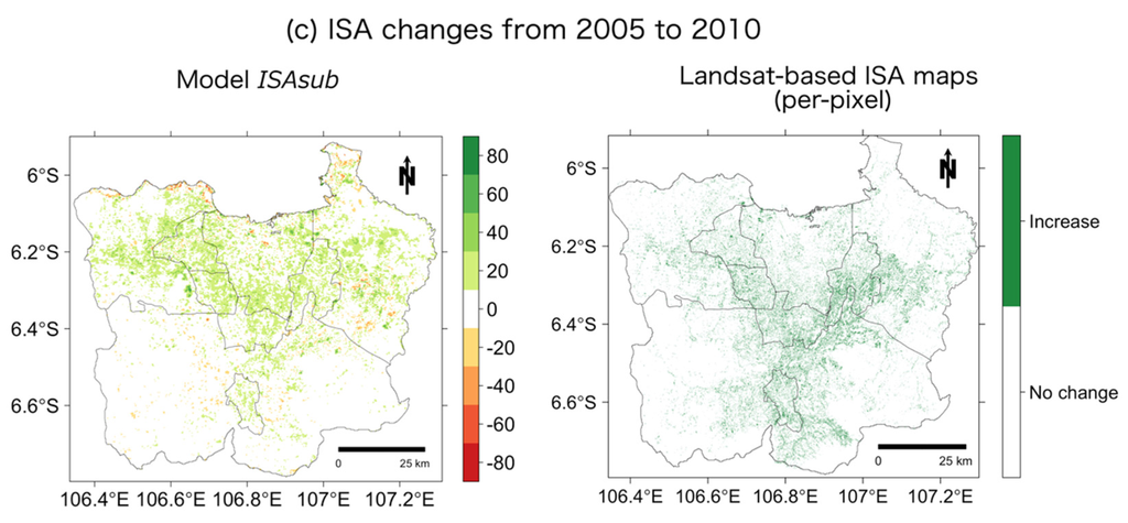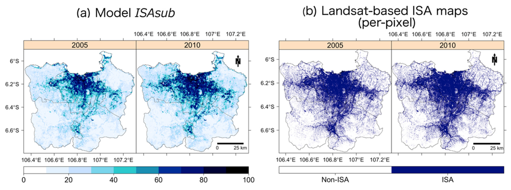 In order to estimate the total area of ISA from Model ISAsub, the area size of ISA was calculated by multiplying the area of impervious pixel by the proportion of the ISA in each pixel:
