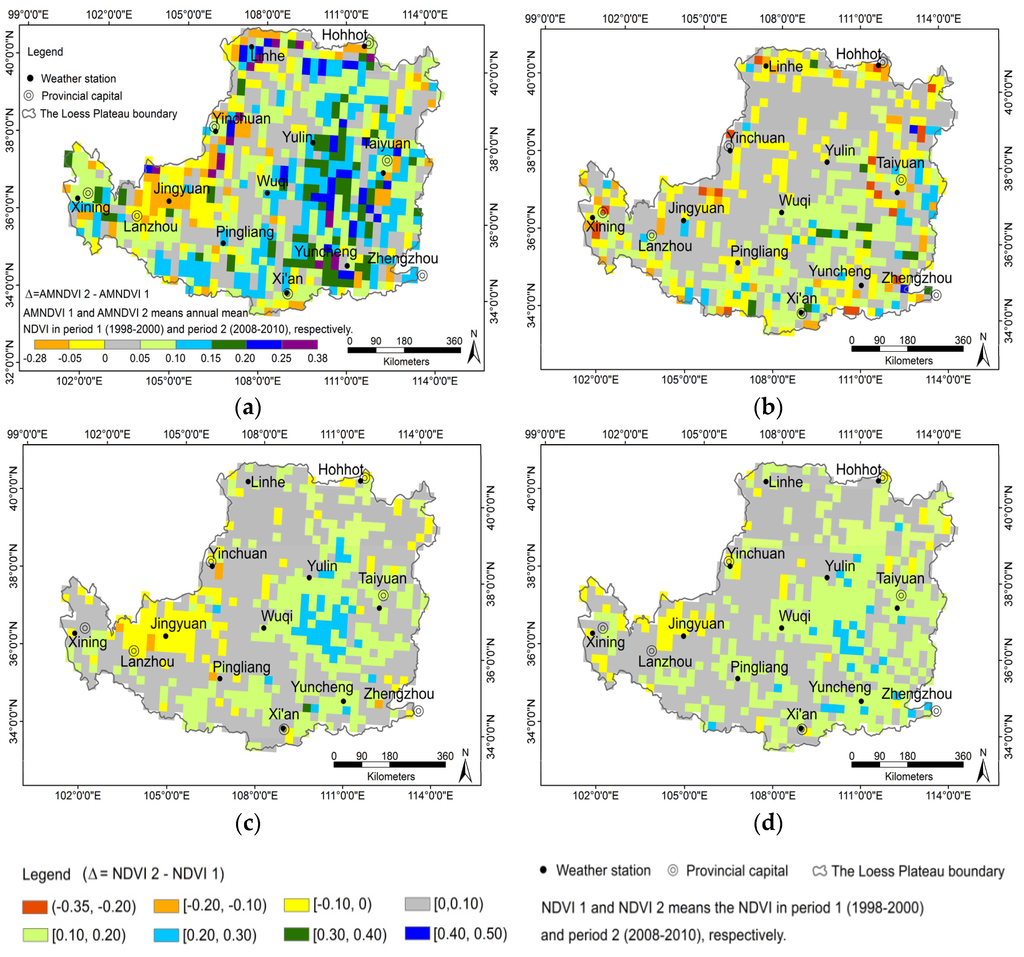 Compared with 1998–2000, more than 80.99% of the Loess Plateau had a distinctly increased NDVI in 2008–2010 (Figure 3a) except some small patches and areas in the north of Lanzhou City, the north of Yinchuan City, the south of Xining, and periphery of Xi’an City. In spring, the area with increased NDVI accounted for 77.46% of the Loess Plateau (Figure 3b). In summer, the regions with increased NDVI accounted for 88.63% of the area (Figure 3c). Autumn NDVI increased significantly for approximately 93.76% of the Loess Plateau over the 10 years (Figure 3d).