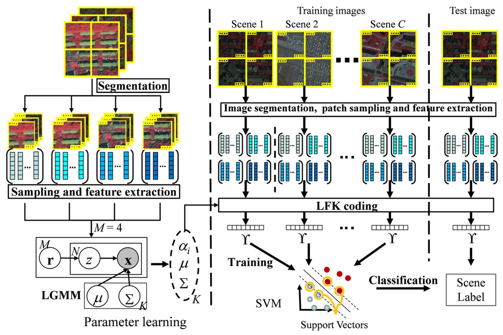- The incorporation of spatial information into the scene classification under the FK coding framework, where the LGMM is able to incorporate the spatial information during the codebook learning of the low-level features, and LFK coding is correspondingly proposed to utilize this local information in the codebook.