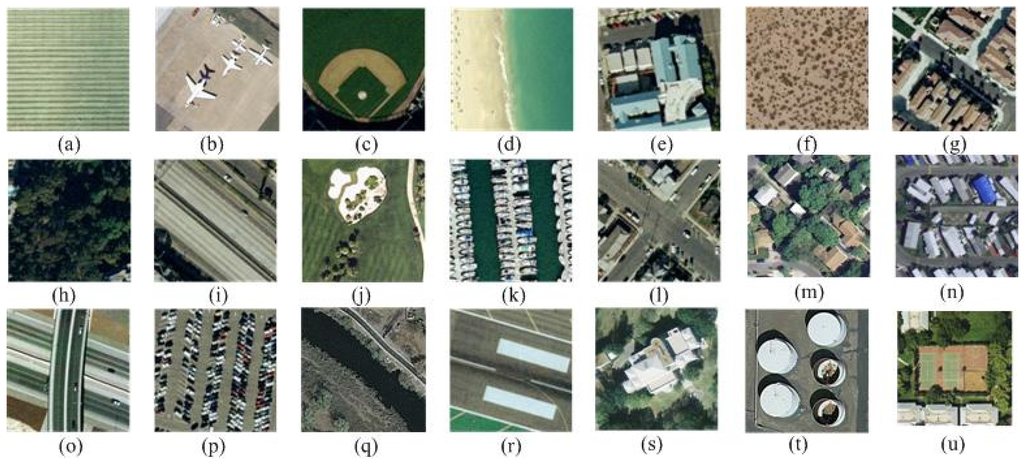 UCM dataset. (a–u) agricultural, airplane, baseball diamond, beach, buildings, chaparral, dense residential, forest, freeway, golf course, harbor, intersection, medium residential, mobile home park, overpass, parking lot, river, runway, sparse residential, storage tanks, and tennis courts.