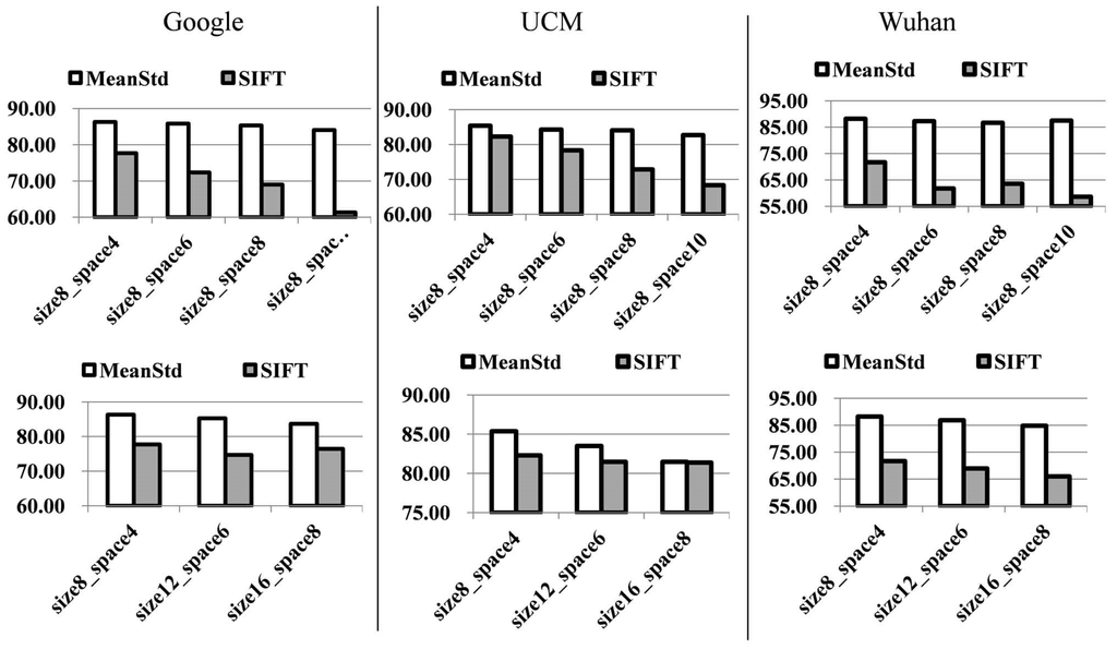 In the experiments, the BOVW, LDA, and P-LDA scene classification methods employed the mean and standard deviation statistics as the low-level feature extractor, in the same way as the FK-O and FK-S scene classification methods. For the SPM scene classification method, not only the mean and standard deviation statistics, but also the SIFT descriptor, were used to extract the low-level features, and are denoted by SPM-MeanStd and SPM-SIFT, respectively. For SPM, it was found that the number of pyramid levels is better set as one, rather than two, in the experiments with the three datasets. Therefore, the accuracies acquired by SPM with one level of pyramid were used for the comparison. During the low-level feature extraction using the mean and standard deviation statistics or SIFT, the size and spacing of the sampling patch were empirically set. For the three datasets, different sizes and spacings of sampling patches were tested by the use of SPM. The results (Figure 10) showed that it is best to set the patch size and spacing as 8 × 8 pixels and four pixels, respectively.