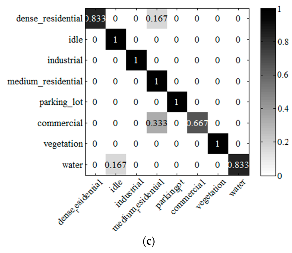 Confusion matrices obtained by the FK-S scene classification method for the three datasets. (a) UCM dataset; (b) Google dataset; (c) Wuhan IKONOS dataset.