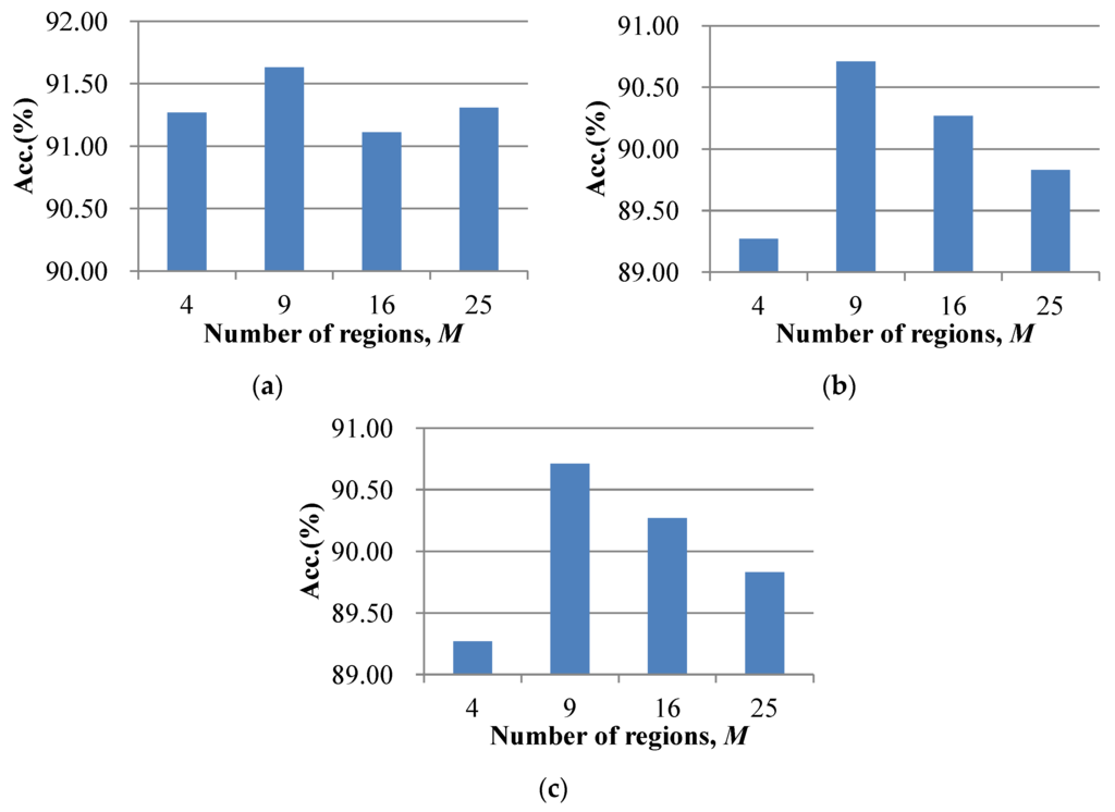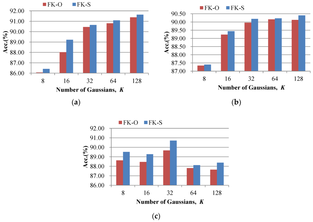 In the FK-O and FK-S scene classification methods, the number of Gaussians K is an important parameter, which is discussed in this section (Figure 12). In addition, the effect of the number of regions M for the FK-S scene classification method is also analyzed (Figure 13).