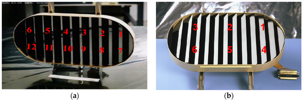 The Suomi Visible Infrared Imaging Radiometer Suite (S-VIIRS) and the MODerate resolution Imaging Spectroradiometer (MODIS) are cross track scanning radiometers orbiting the Earth on a sun synchronous polar orbit with the corresponding altitudes of approximately 824 km and 705 km, respectively [1,2]. The S-VIIRS is on board the S-National Polar-orbiting Partnership platform whereas the MODIS is on board the Terra (T) and Aqua (A) platforms. As of 28 October 2015, the S-VIIRS has completed four years of on orbit flight. The T- and A-MODIS have completed 15 and 13 years of successful on-orbit operation recording the geophysical changes of the Earth in a wide range of spectral channels. Together, the three sensors provide high quality radiometric measurements of the Earth; the S-VIIRS mission is to ensure the continuity of the valuable data records from MODIS. Examples of science products derived from S-VIIRS and compared with MODIS sensor are available in [3,4,5], which cover the ocean, land, and atmospheric science discipline areas. In order to ensure the long term continuity of these data products, the calibrations of the VIIRS and MODIS are extremely critical. In order to achieve the traceability to ground based references, both the VIIRS and MODIS instruments are bestowed with robust on-board calibrators (see Figure 1a,b). In this paper, we focus on the S-VIIRS and A-MODIS bands with wavelengths longer than 3.7 µm. These bands are referred to as Thermal Emissive Bands. The calibration of the S-VIIRS and A-MODIS is based on a similar v-grooved BlackBody (BB) as shown in Figure 2a,b, whose temperature measurements were traceable to the National Institute of Standards and Technology temperature scales [6]. Further, the MODIS BB is monitored using 12 thermistors whereas the VIIRS BB is monitored via 6 uniformly spaced thermistors. The individual thermistor locations are roughly shown in Figure 2a,b.
